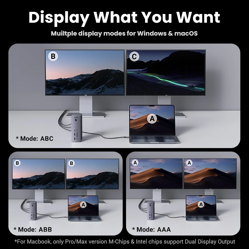 Dual 4K@60Hz or Single 8K Display: The Thunderbolt 4 Docking station can extend two displays in up to 4K@60Hz or a single display in up to 8K@30Hz (macOS only supports 4K@60Hz). Greatly improve your work efficiency and display experience. (For Macbook, only Pro/Max version M-Chips & Intel chips support Dual Display Output)