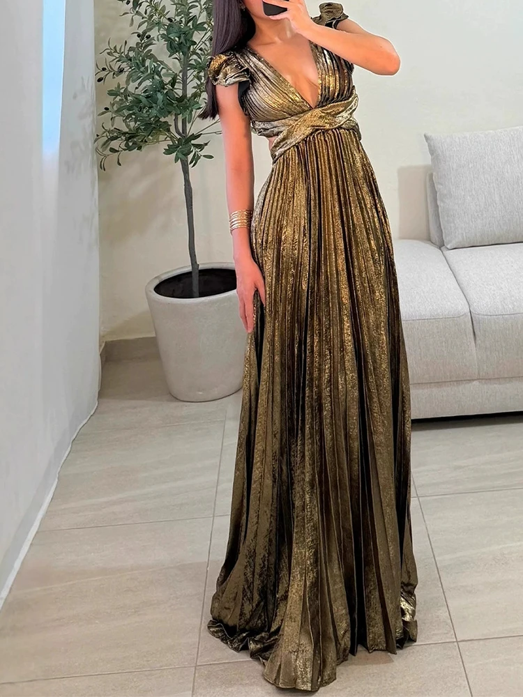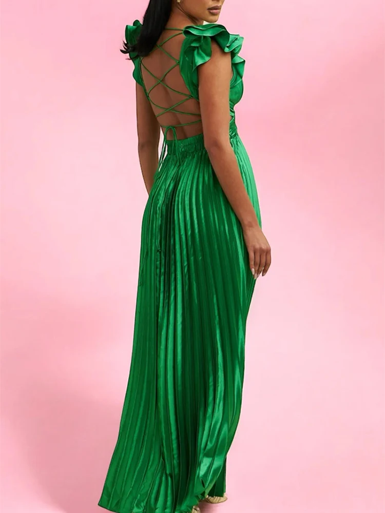 V-neck backless strap pleated skirt high waist side zipper large swing skirt casual party long skirt dress