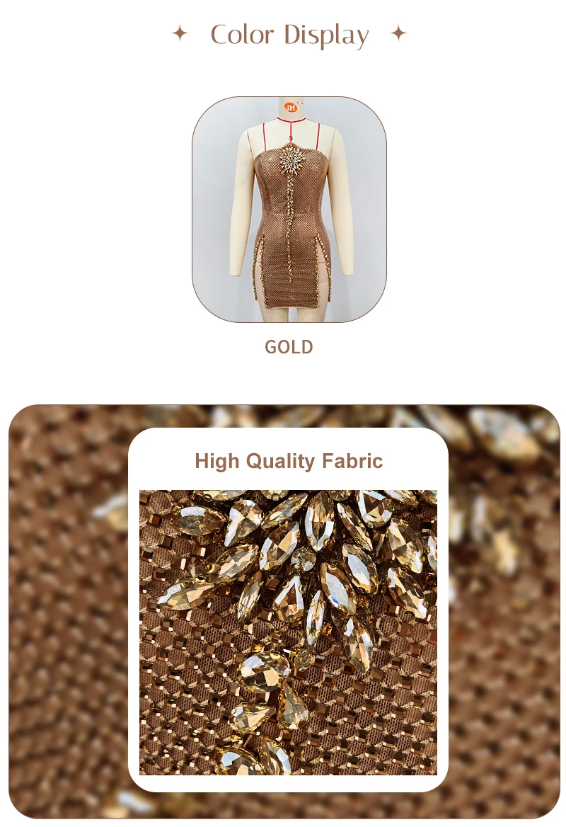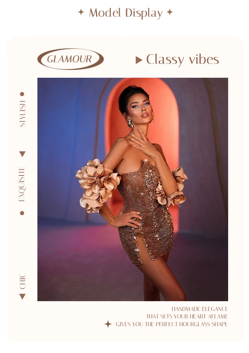 This champagne gold full-rhinestone spaghetti strap mini gown is made for high-end nightclub parties. The all-over rhinestone fabric shines intensely under club lights, while the chest flower embellishment and side slits add bold, eye-catching details. The spaghetti strap design and mini length keep the look energetic—perfect for dancing and standing out in high-energy nightlife settings.