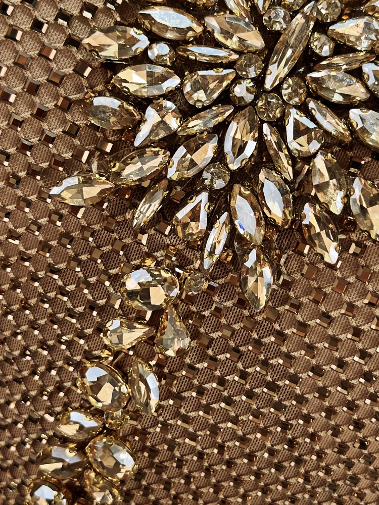 This champagne gold full-rhinestone spaghetti strap mini gown is made for high-end nightclub parties. The all-over rhinestone fabric shines intensely under club lights, while the chest flower embellishment and side slits add bold, eye-catching details. The spaghetti strap design and mini length keep the look energetic—perfect for dancing and standing out in high-energy nightlife settings.