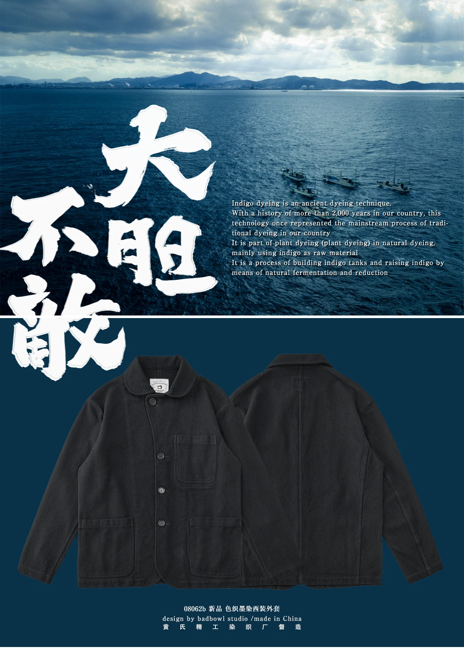 Design highlights: This suit jacket is made of brand-new fabrics, and ink dyeing is added after plant dyeing to obtain a deeper color (closer to black) than indigo dyeing, such as ink.
