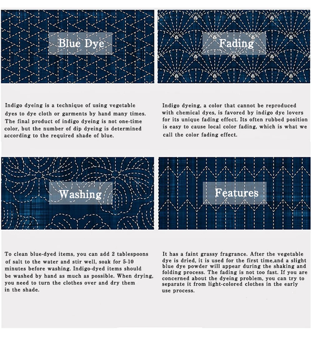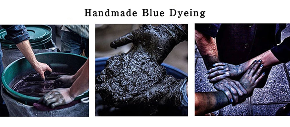 The blue dyed products in our shop are all hand-dyed by ancient methods. The indigo dyes used are all fermented from pure natural plants, because the adhesion of the dye itself is very low, and the blue color is formed by oxidation in contact with air, even so , The cotton core part is also difficult to dye transparently.Therefore, through long-term wearing and washing, the sharp contrast between blue and white will appear on the friction part. And the good blue dye is not not fading, but maintains the stability of the shape after fading, does not deform, and has a small shrinkage rate.