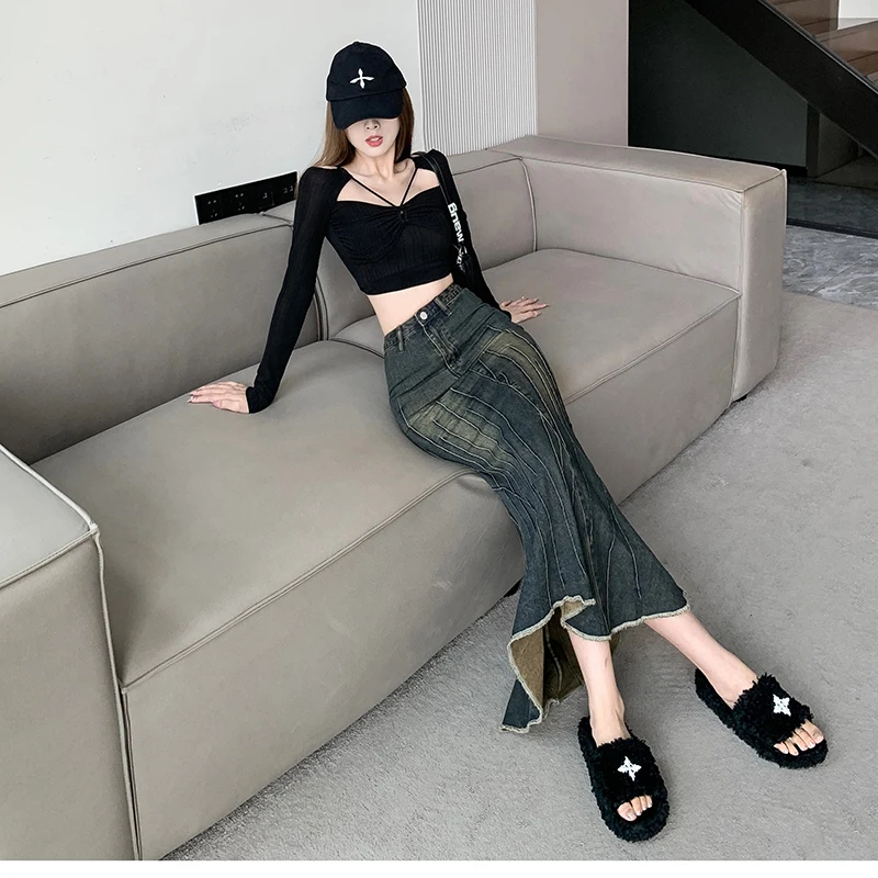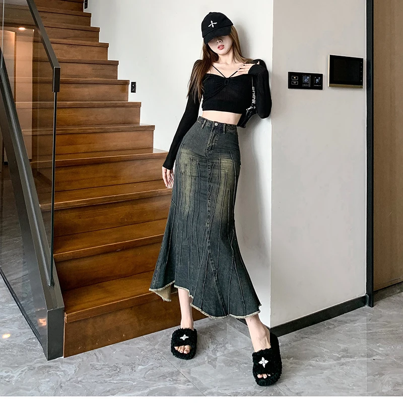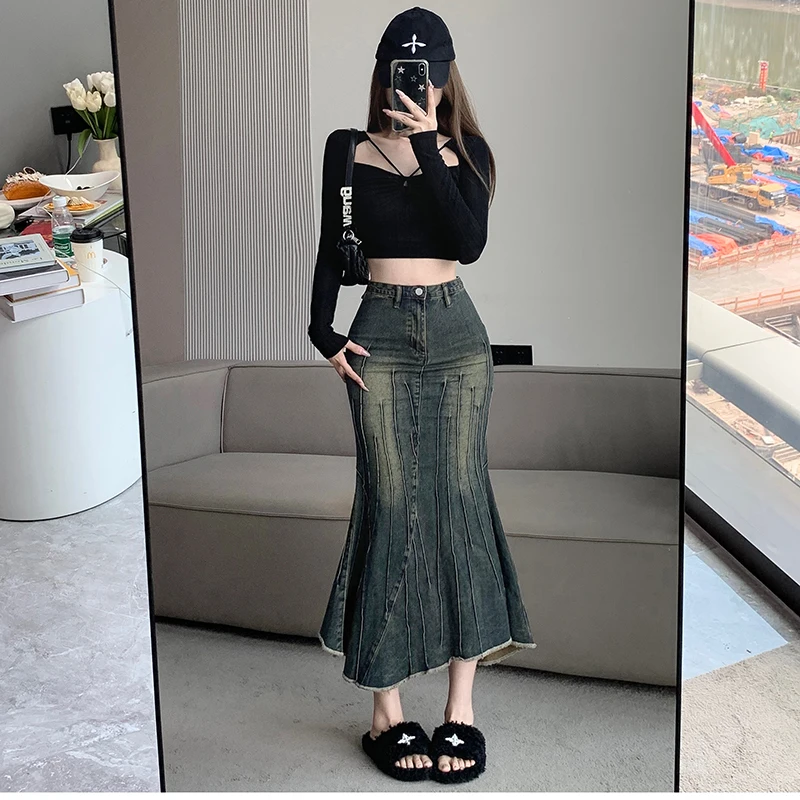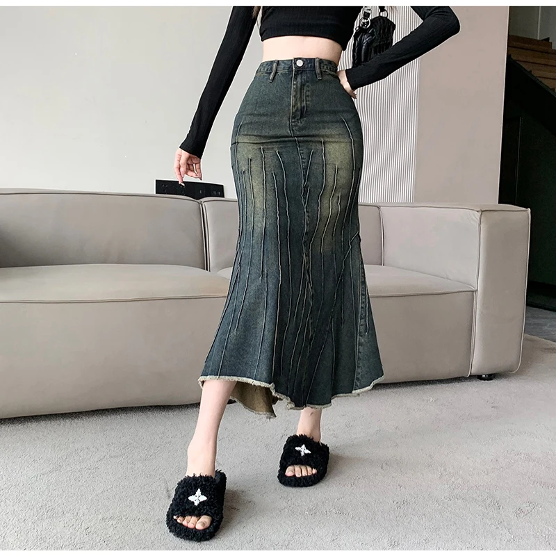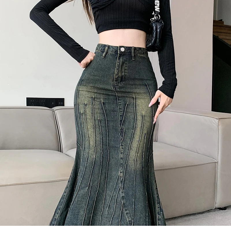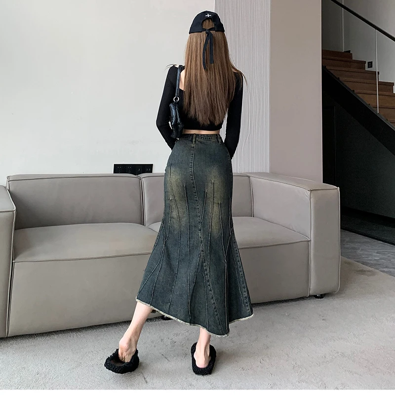 Vintage Ripped Women Mermaid Skirt 2023 New Fashion Y2K Streetwear Jeans Skirts Female Retro Casual Irregular Hip Skirts Denim