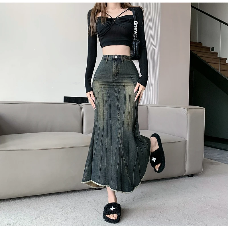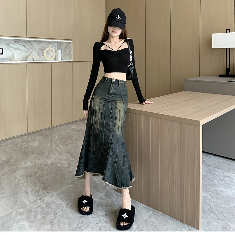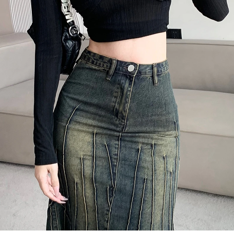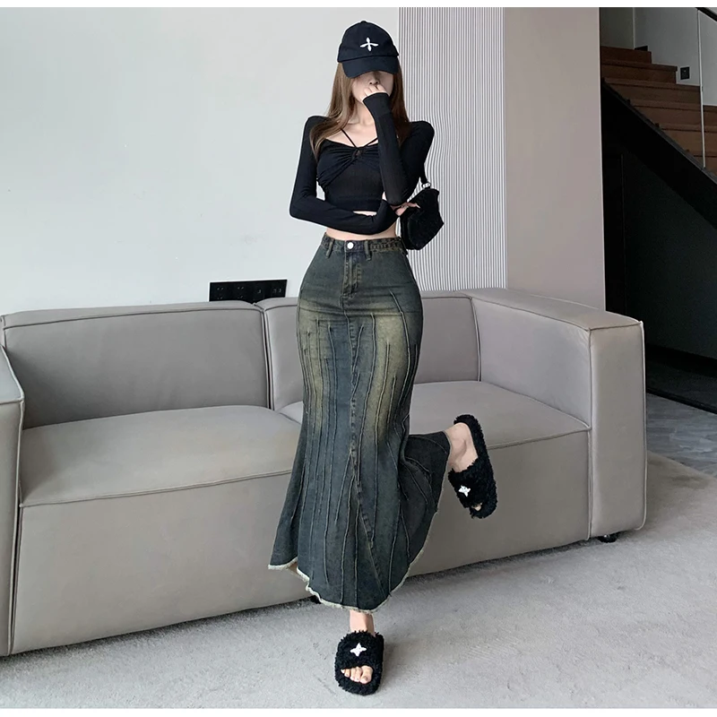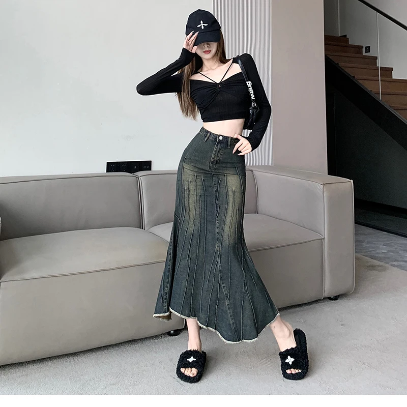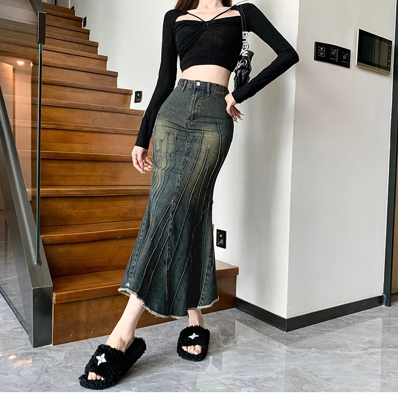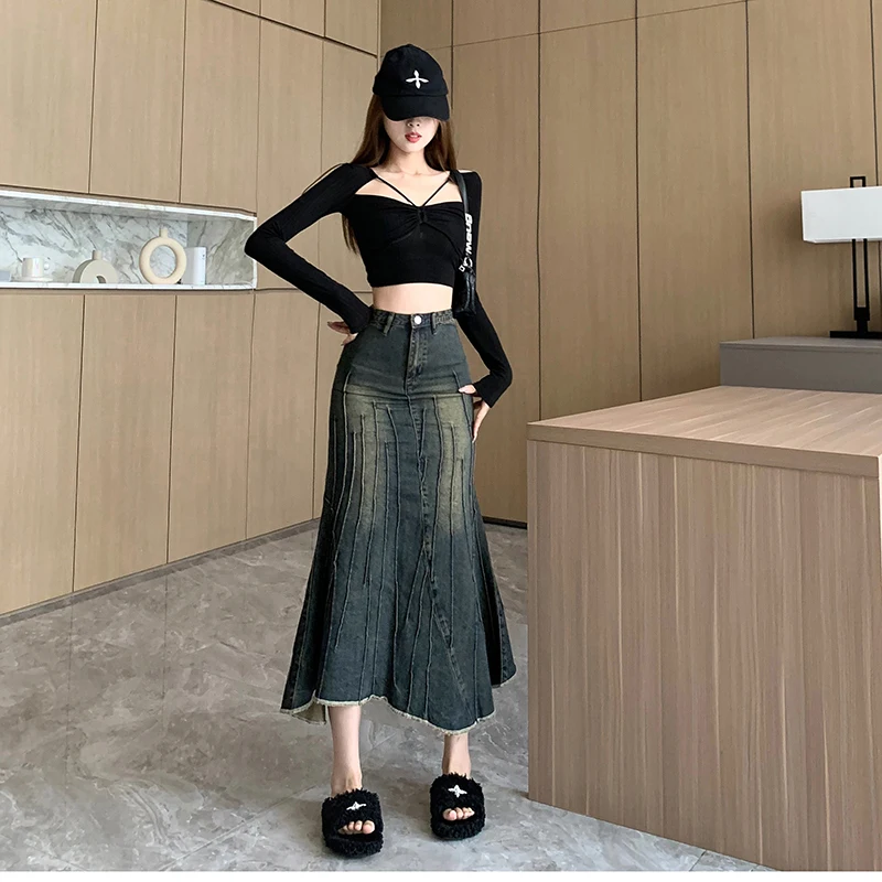 Vintage Ripped Women Mermaid Skirt 2023 New Fashion Y2K Streetwear Jeans Skirts Female Retro Casual Irregular Hip Skirts Denim