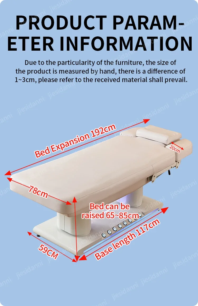 The White Gold Beauty Salon Electric Cosmetic Facial Spa Lash Massage Bed is not just a functional piece of equipment; it’s a statement of elegance.The bed’s white gold color scheme and sleek design blend seamlessly with any beauty salon decor, making it an asset to your establishment.The bed’s dimensions are generous, providing ample space for clients to stretch out and relax.The lightweight frame makes it easy to move around, ensuring that your beauty professionals can work efficiently without strain.