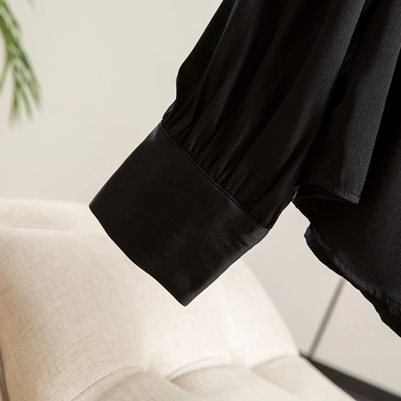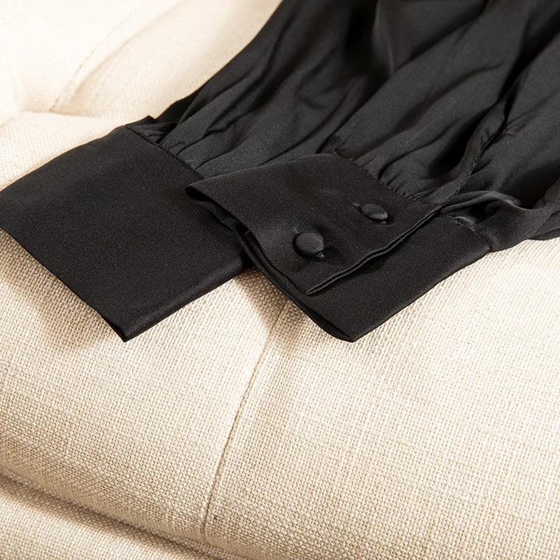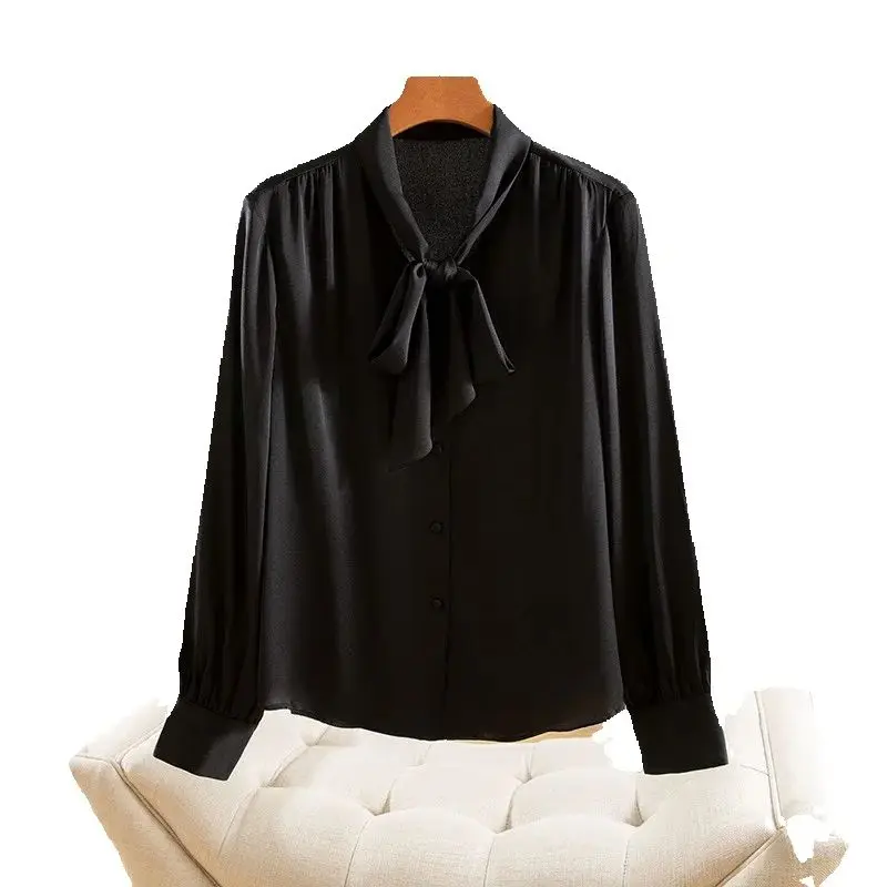 Winsleter- 93% Silk Elegant Shirt For Women, Long Sleeve Lace-up, French Temperament Party Black Blouse, 2025 Spring
