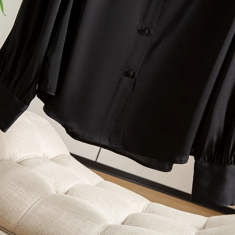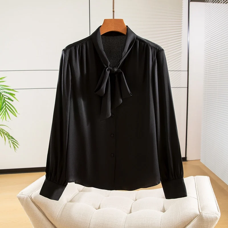 Winsleter- 93% Silk Elegant Shirt For Women, Long Sleeve Lace-up, French Temperament Party Black Blouse, 2025 Spring