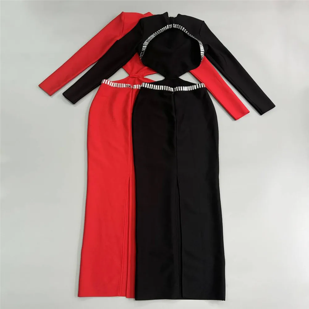 Women Elegant Bandage Dress 2024 New Sexy Beading Hollow Out Bodycon Clothes Club Party Celebrity Long Dresses