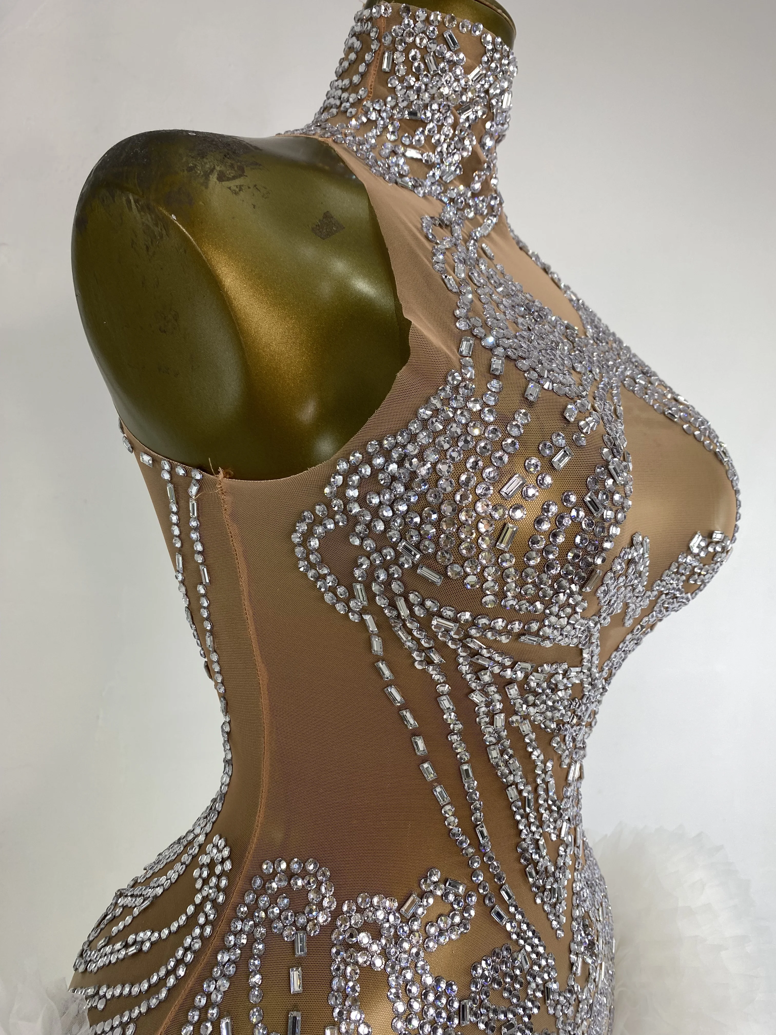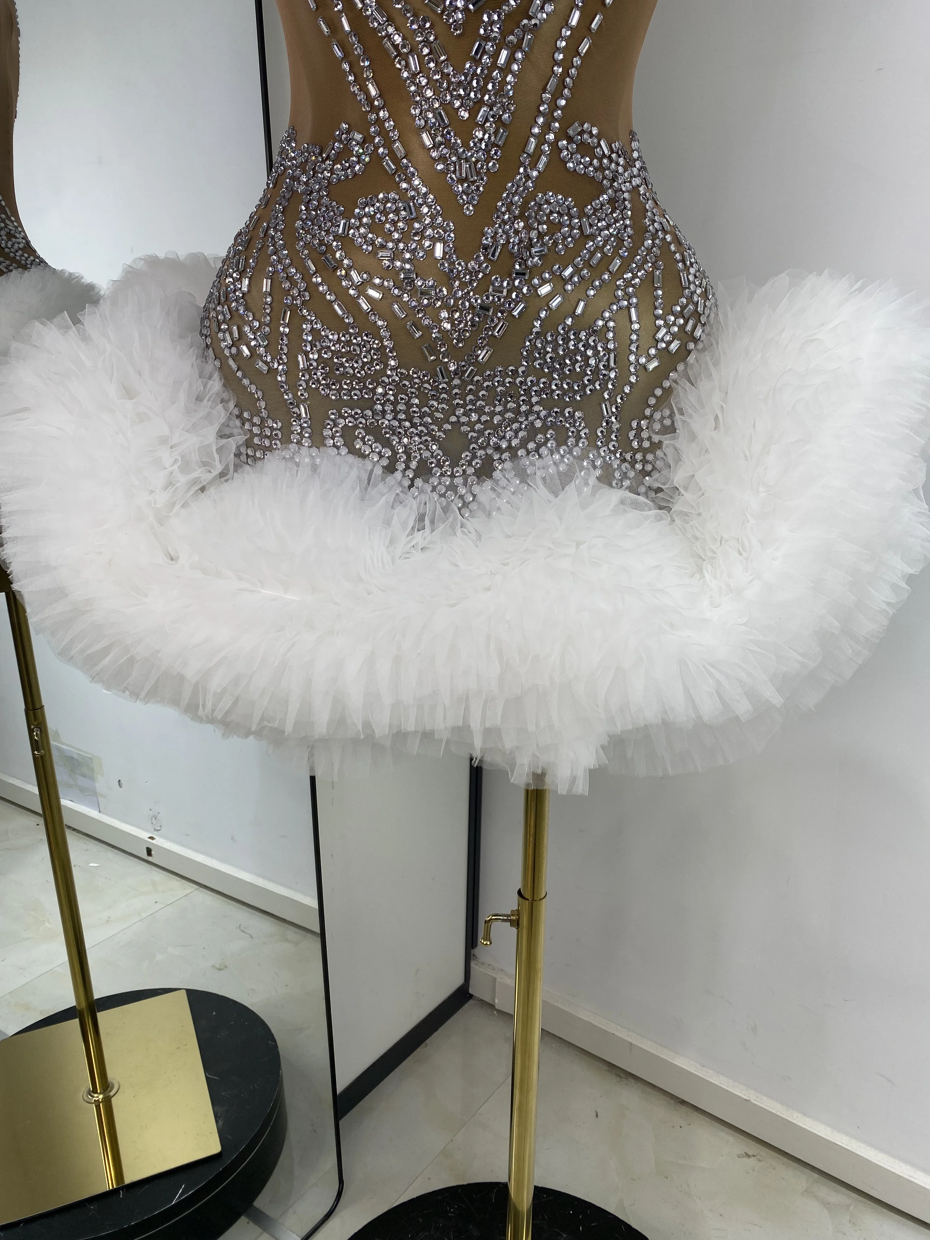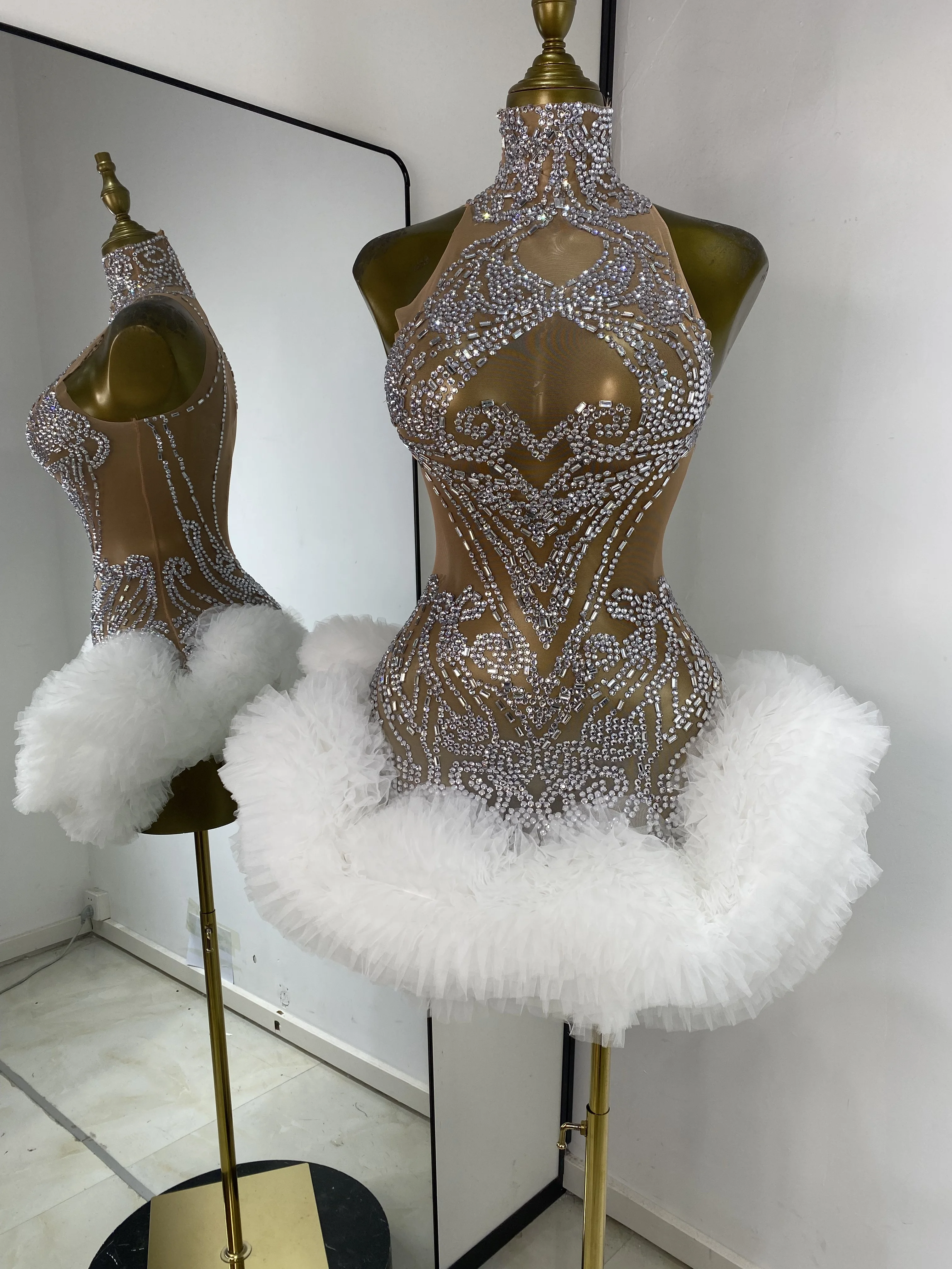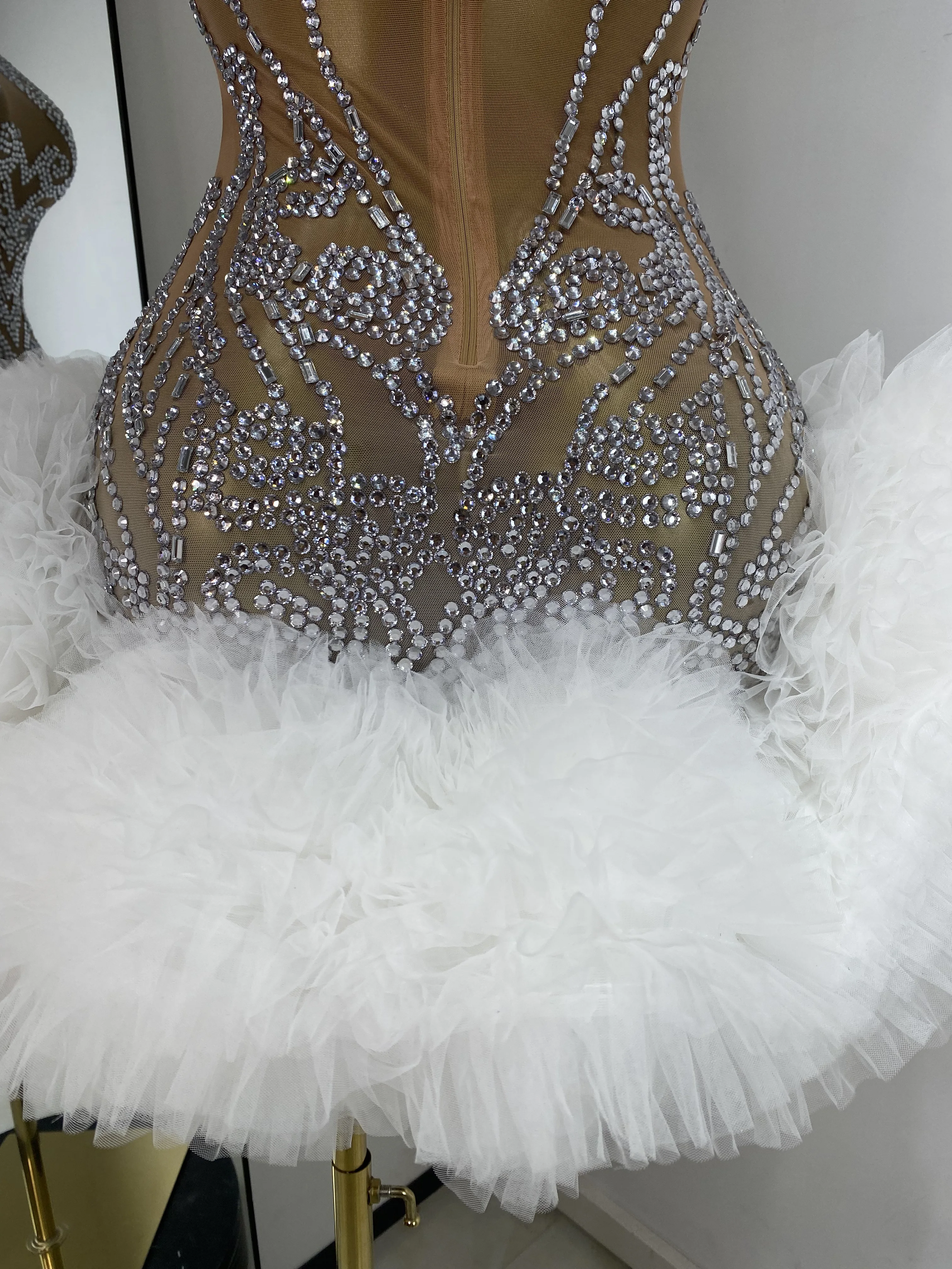 Women Rhinestones Mesh Transparent White Tutu Bodycon Dress Performance Costumes Celebrity Evening Club Party Birthday Dresses