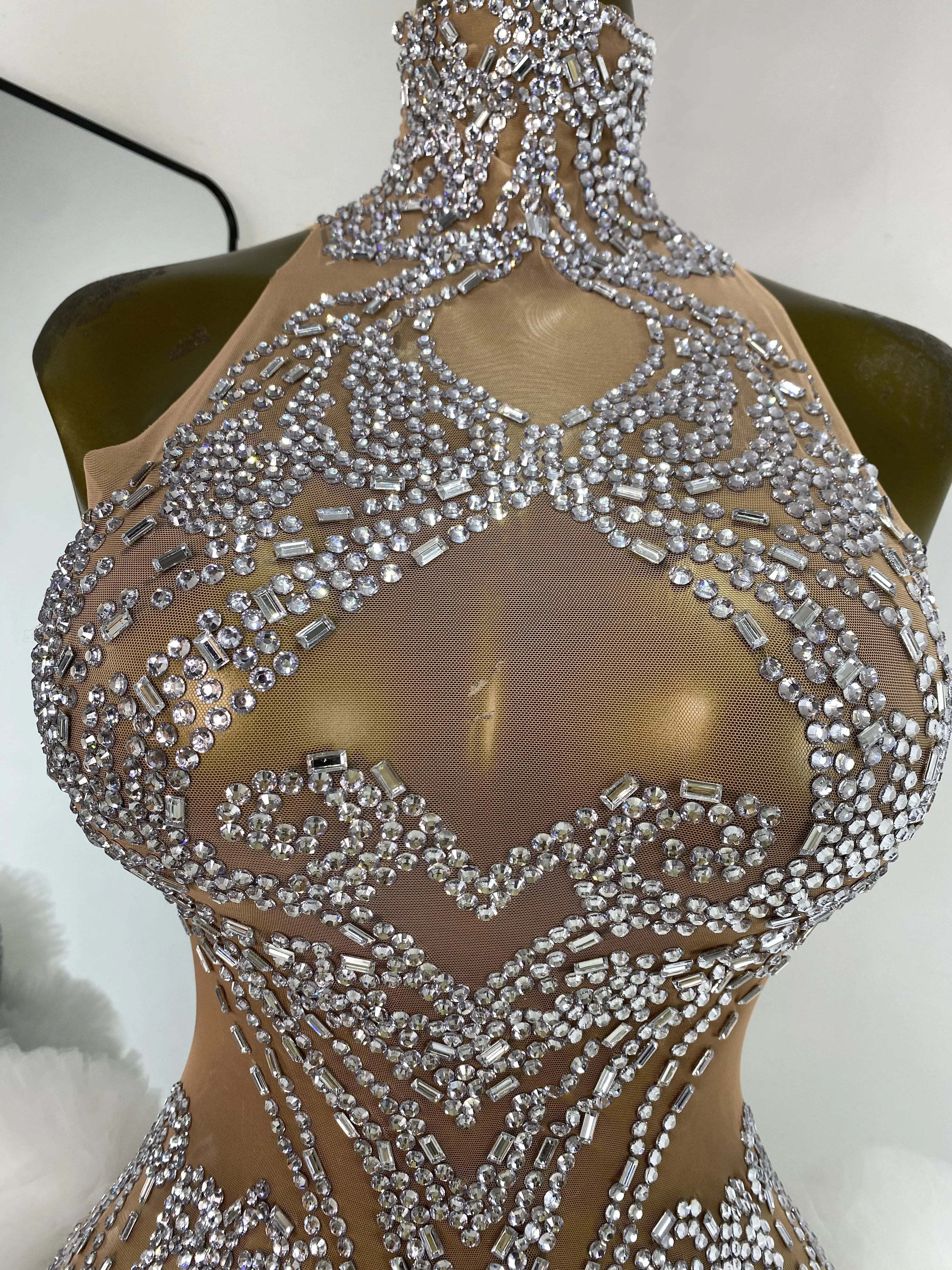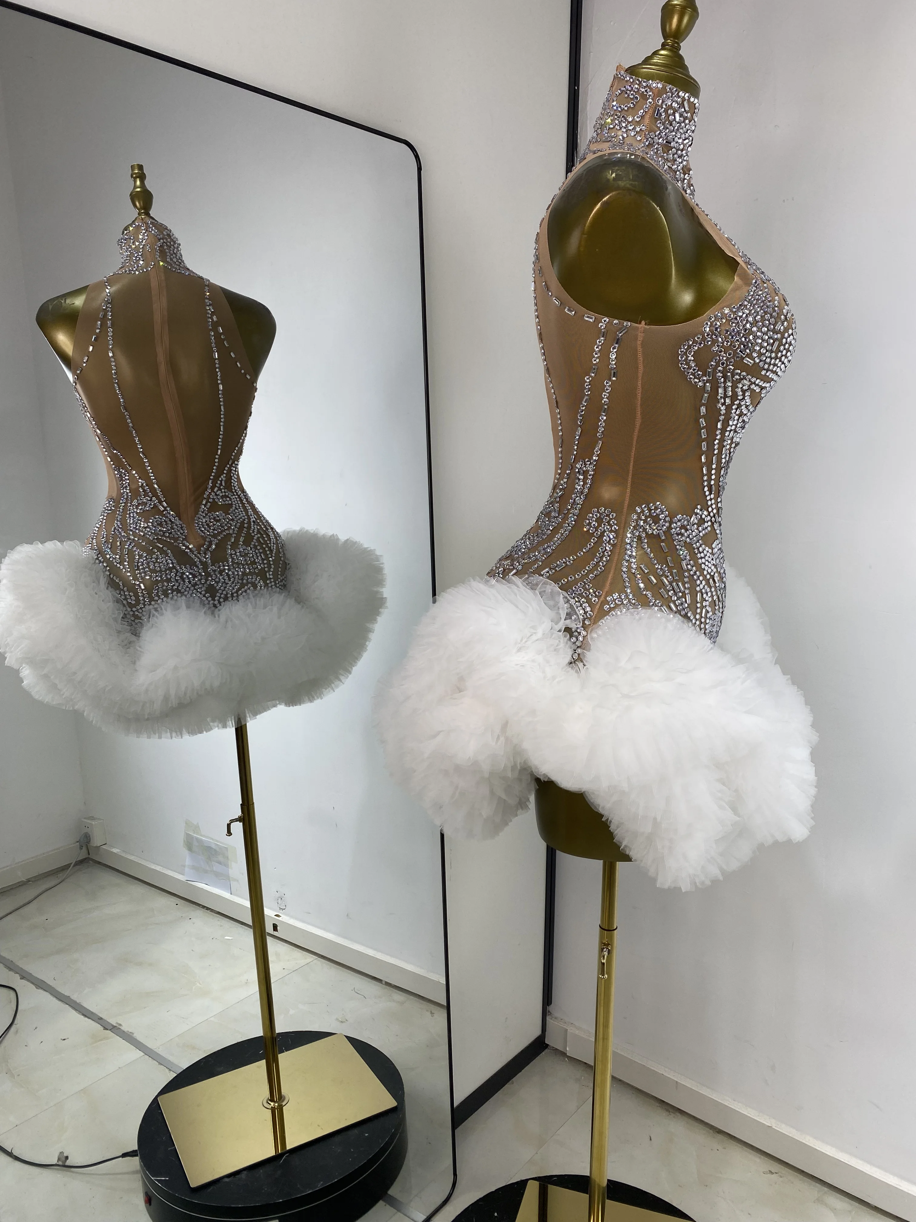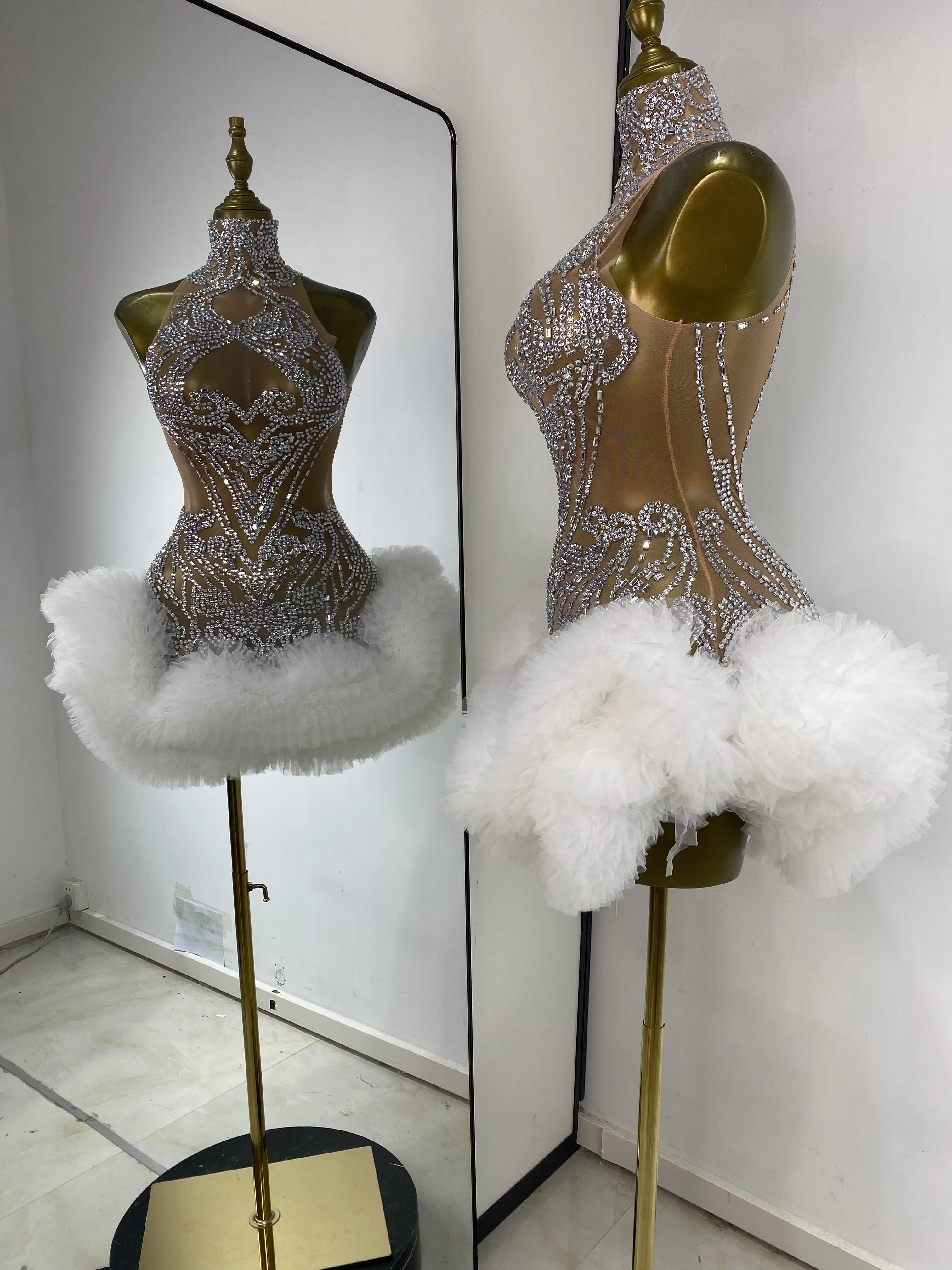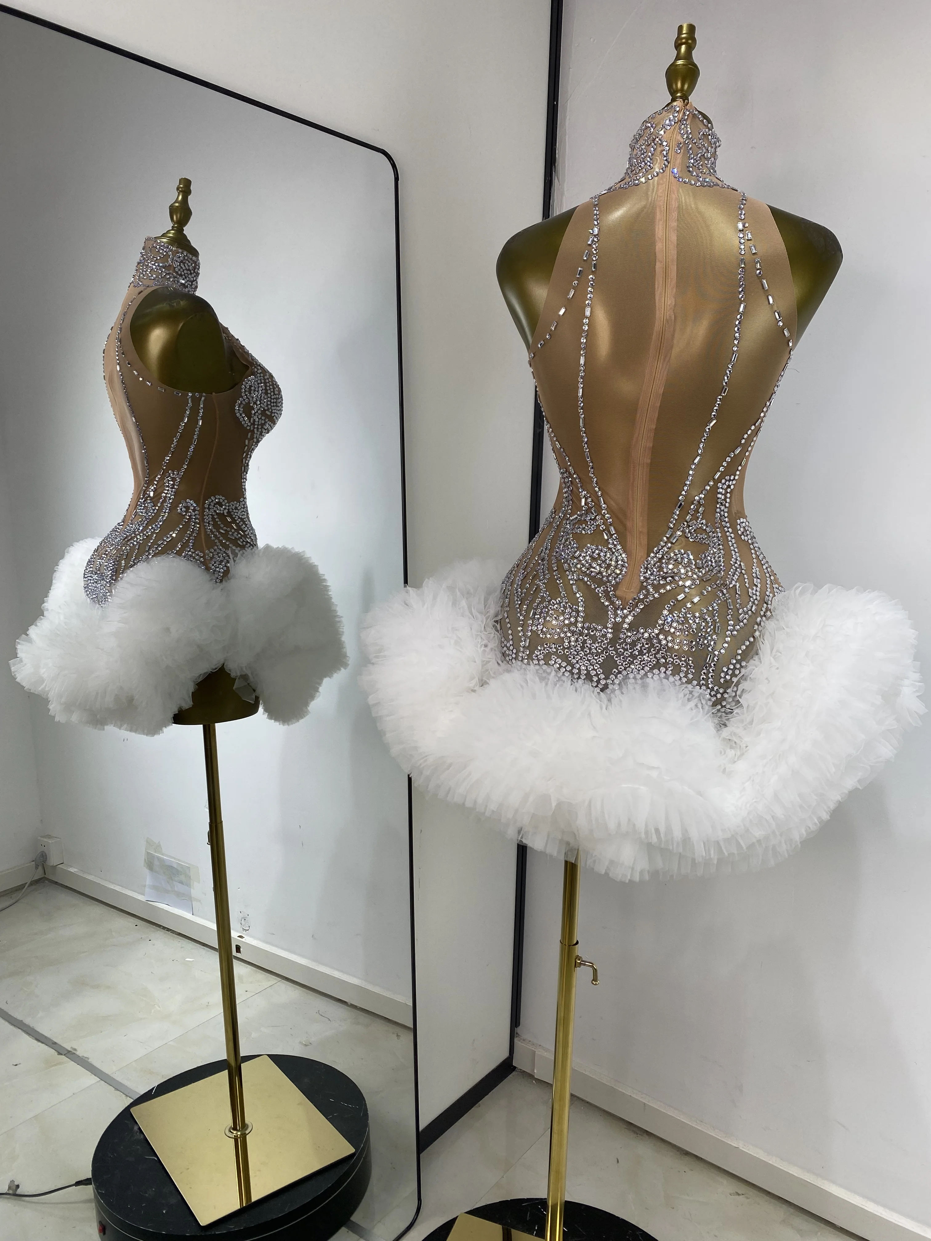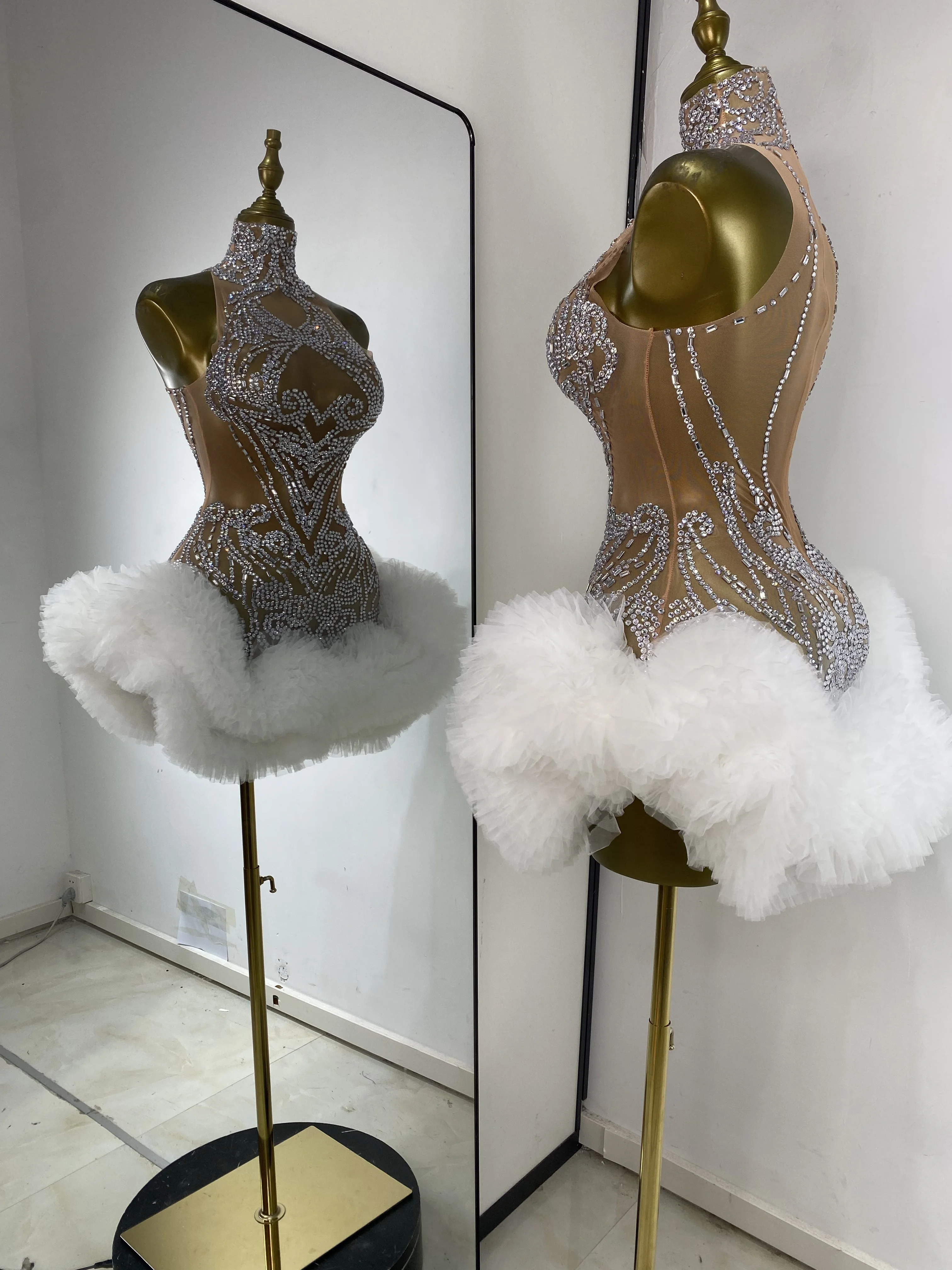 Women Rhinestones Mesh Transparent White Tutu Bodycon Dress Performance Costumes Celebrity Evening Club Party Birthday Dresses