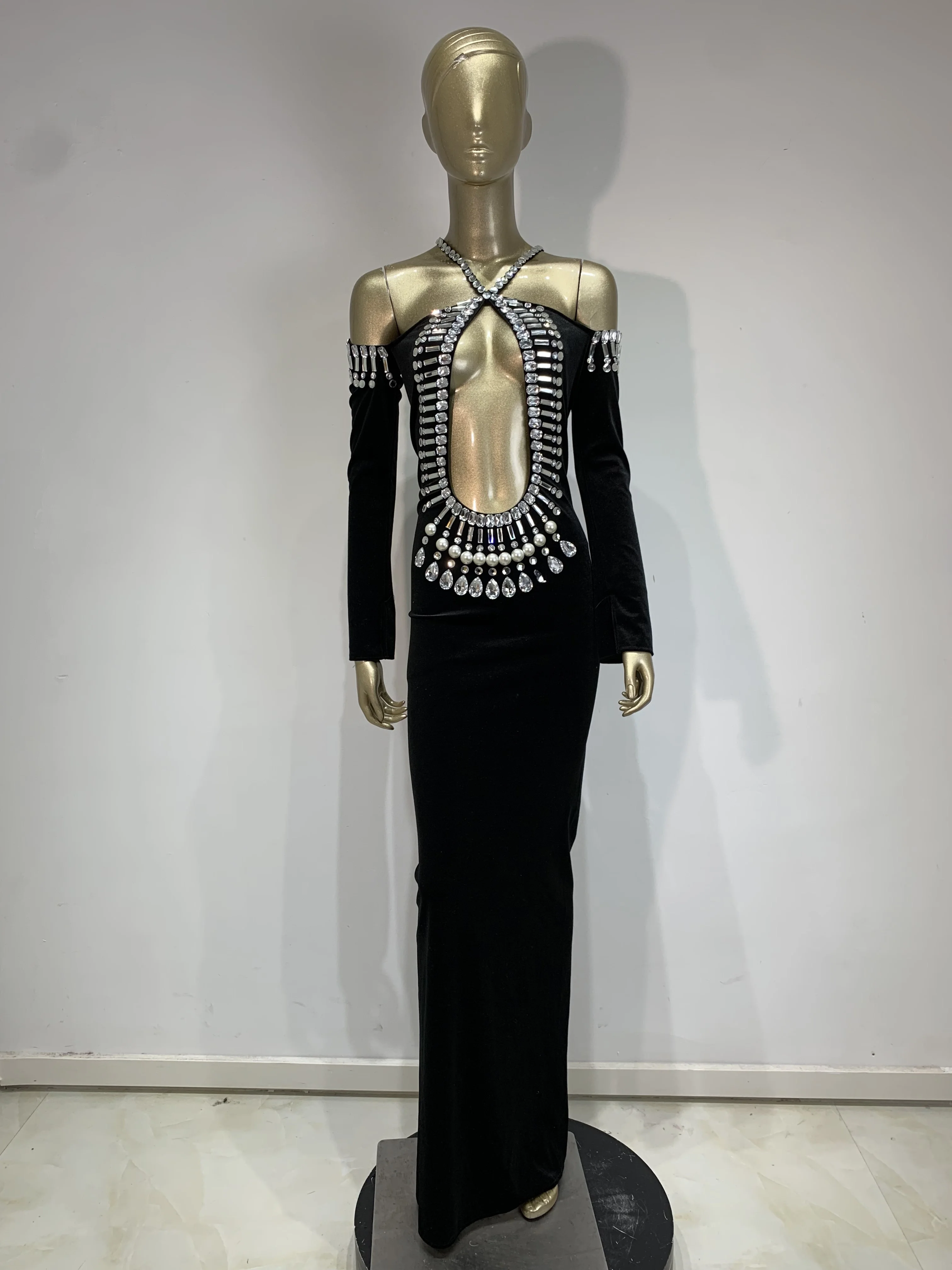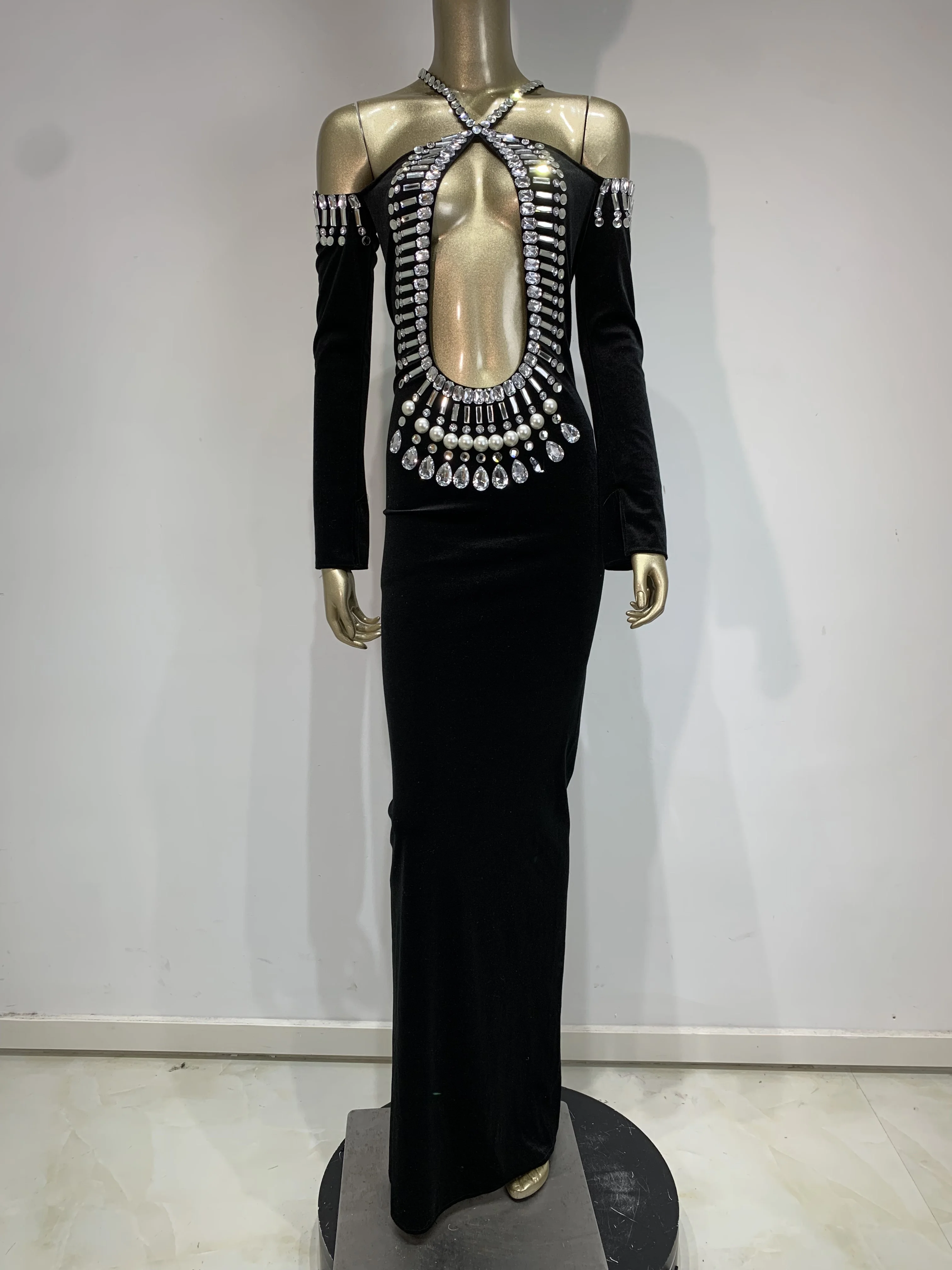 Women Sexy Hollow Out Bodycon Sexy Full Diamond Pearl Long Dress Nightclub Bar Party Performance Costume Luxury Birthday Dress