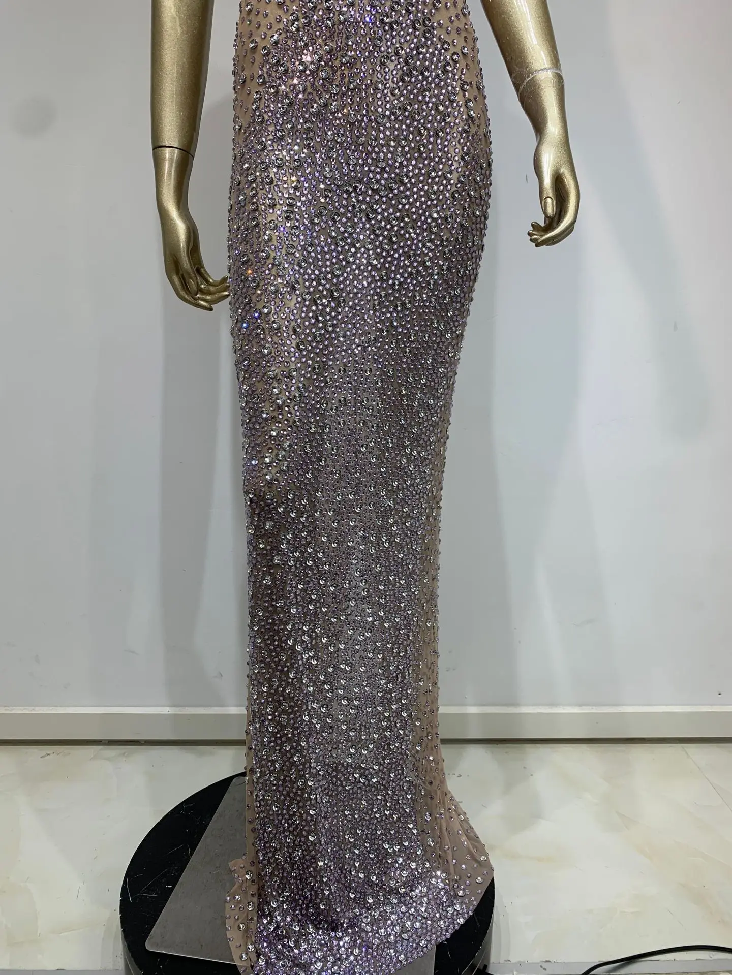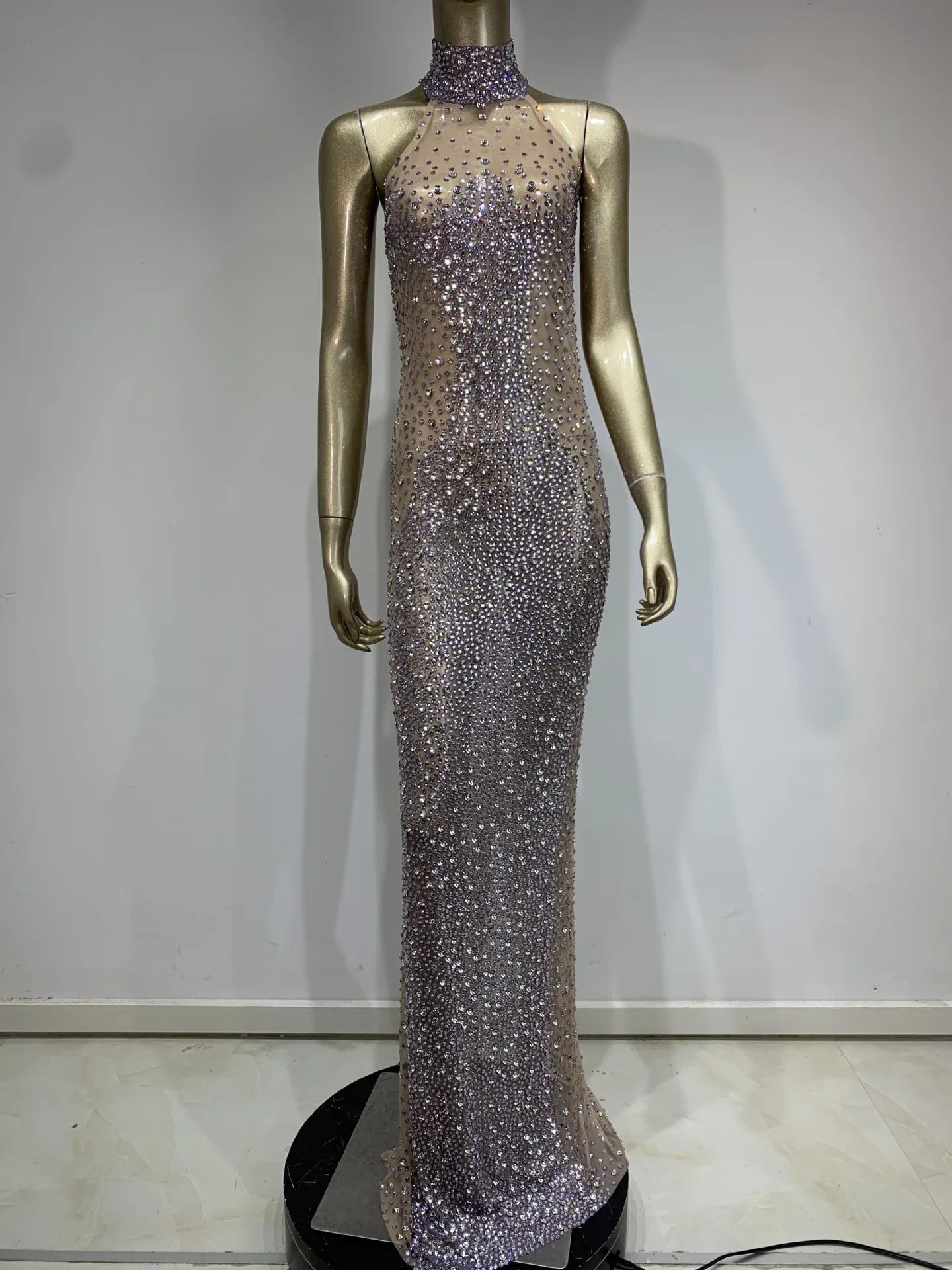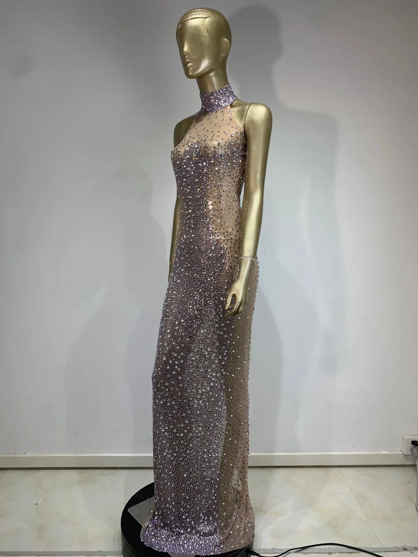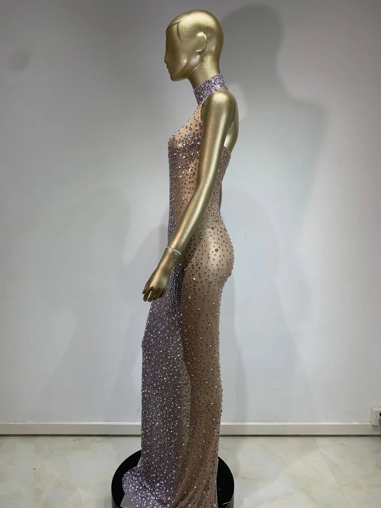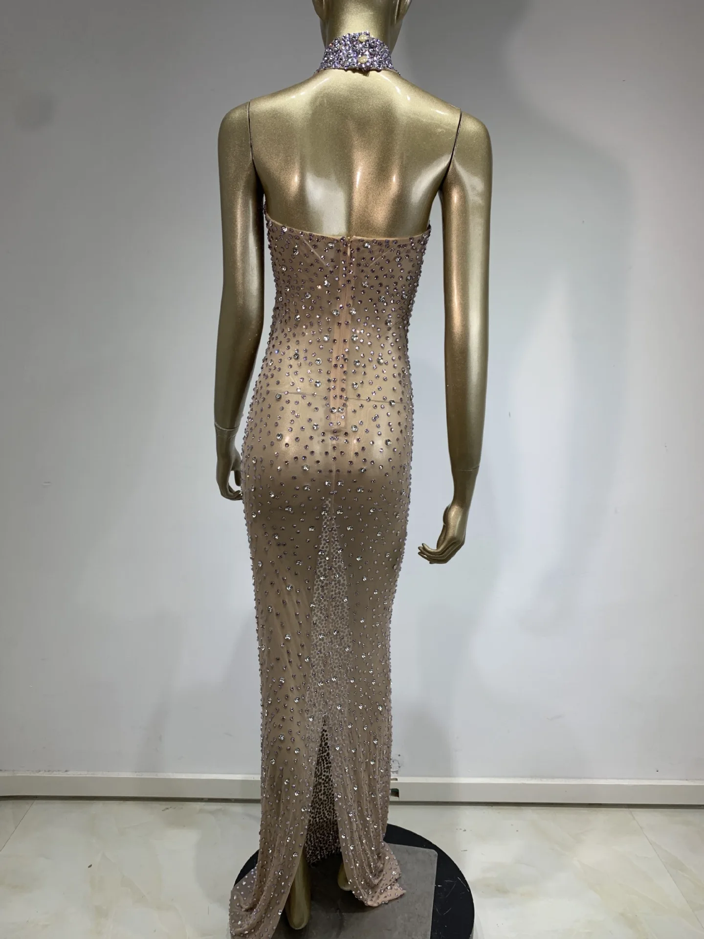 Women Sexy Mesh Sequins Khaki Maxi Long Crystal Diamonds Dress Birthday Party Costume Bar Nightclub Stage Performance Clothing