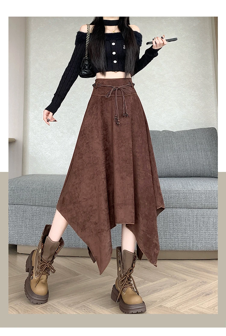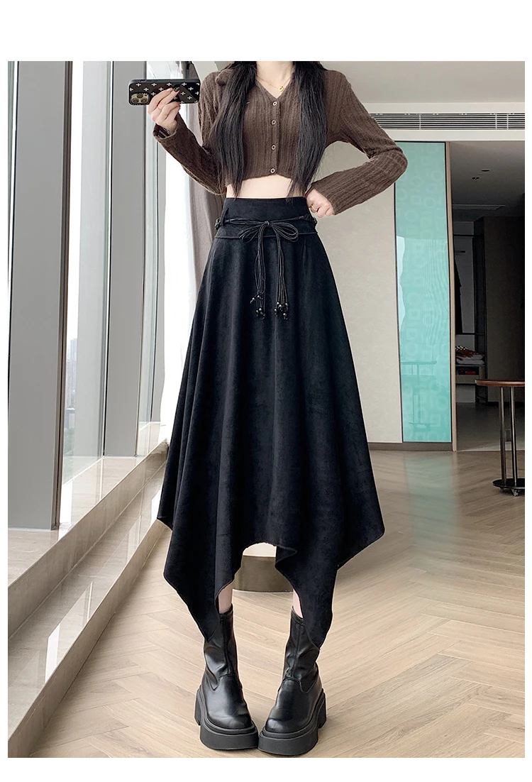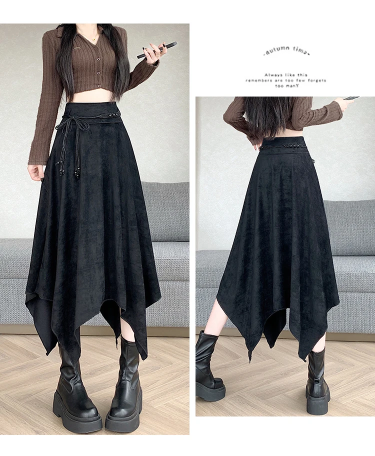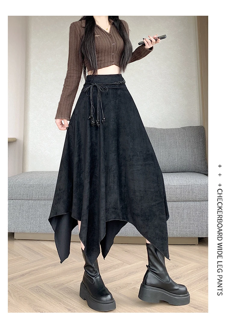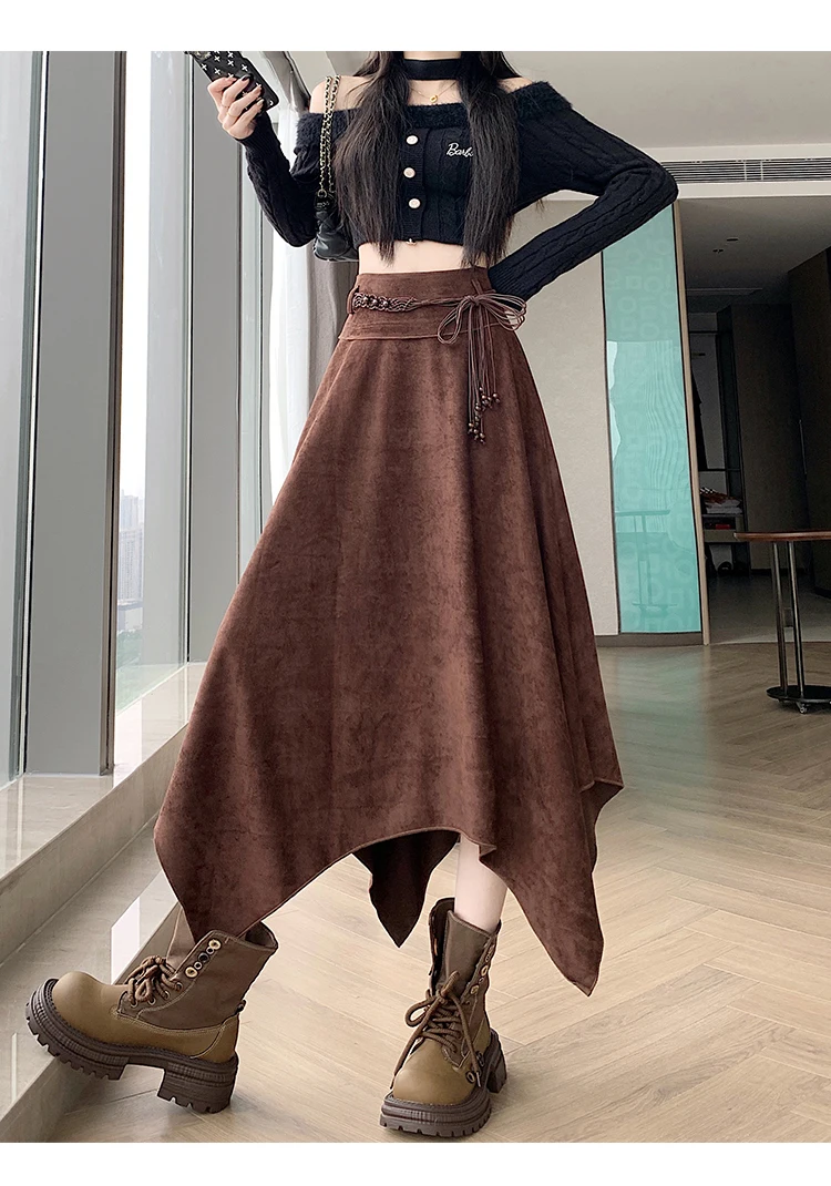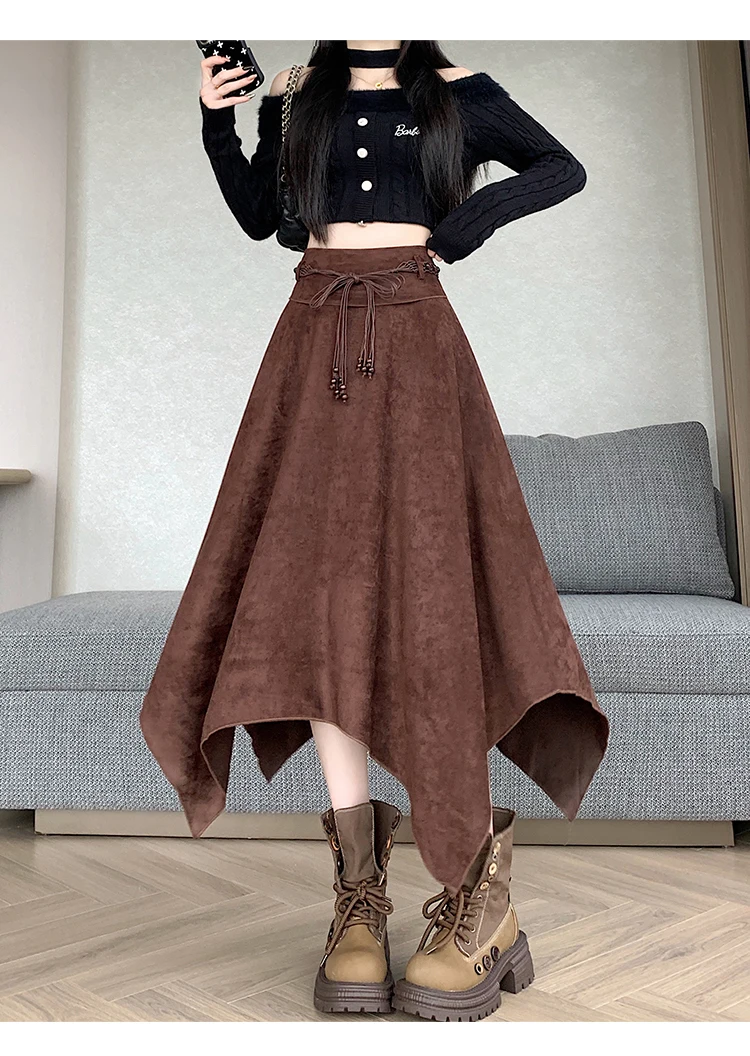 Women’s Desert Vacation Outfit Retro American Black Suede A-line Midi Skirt Belt Asymmetrical Hem Brown Solid Niche Y2K Harajuku
