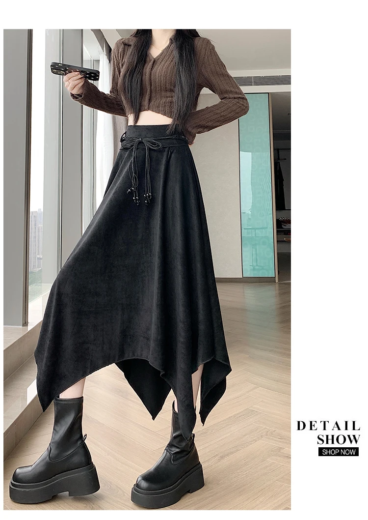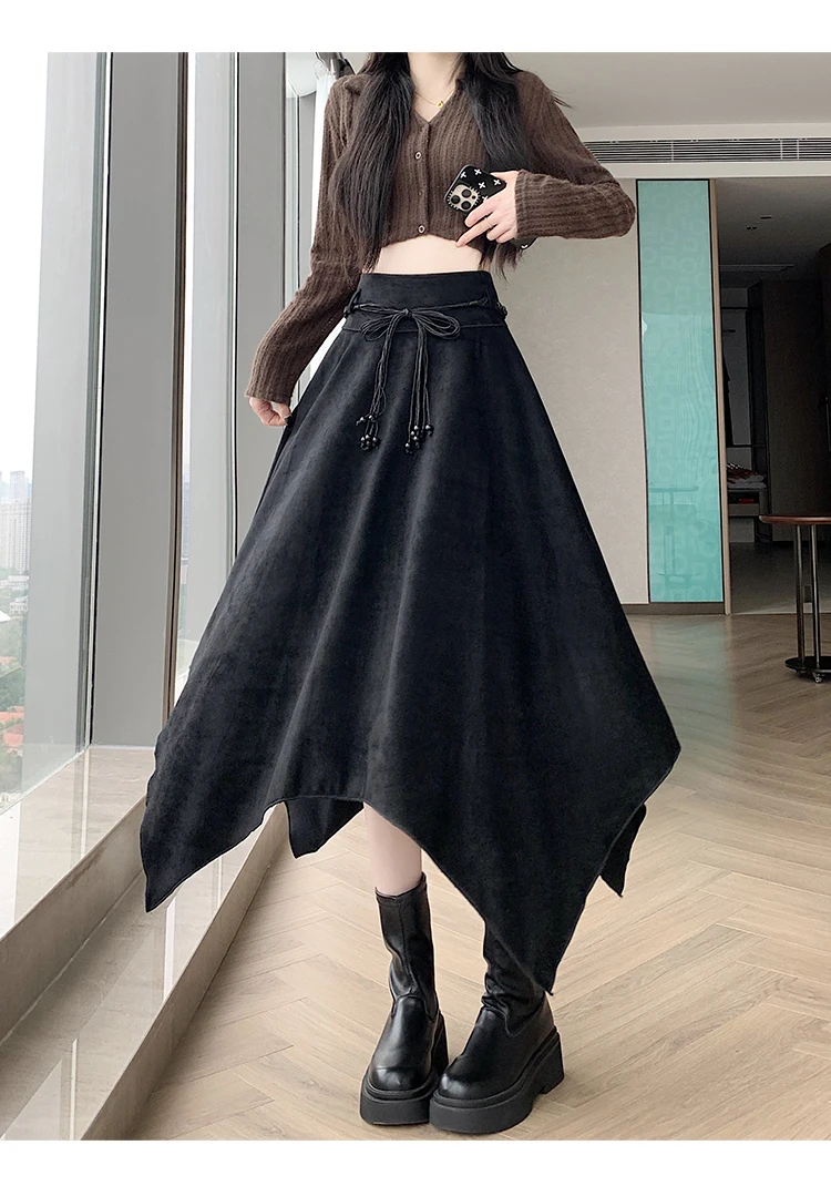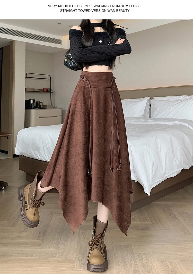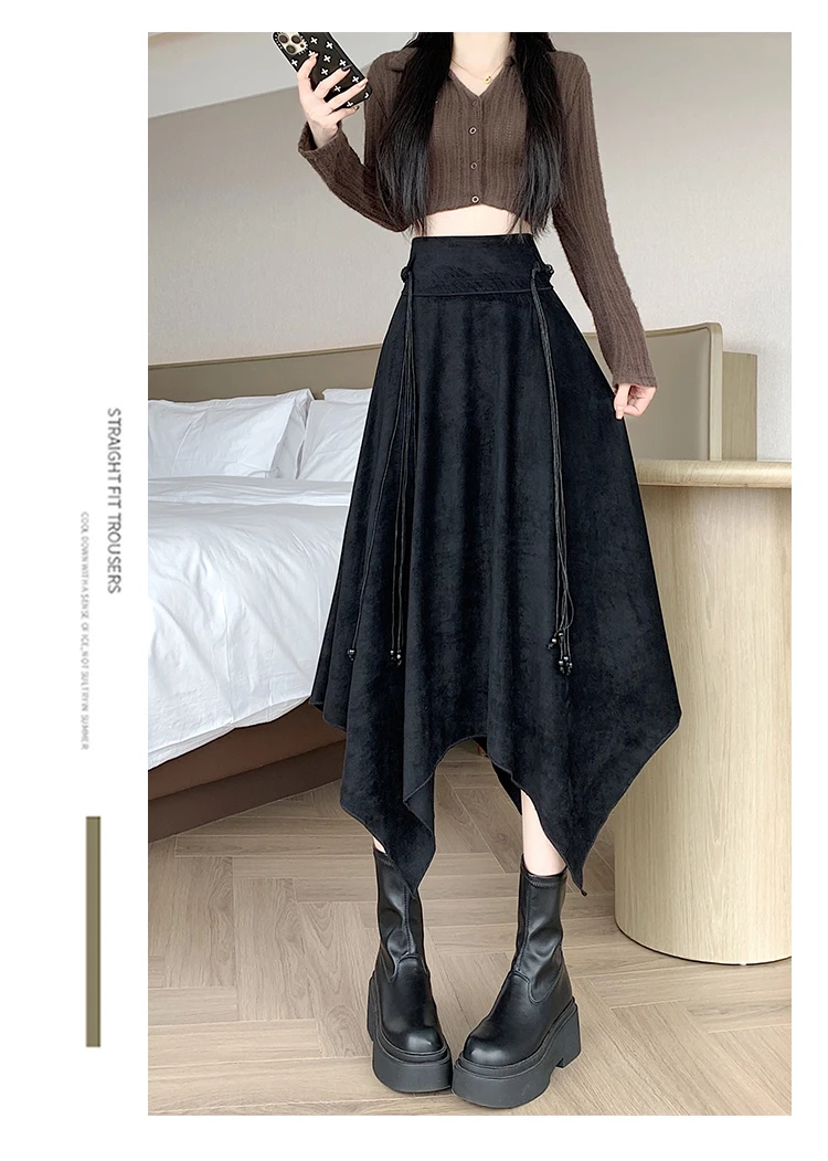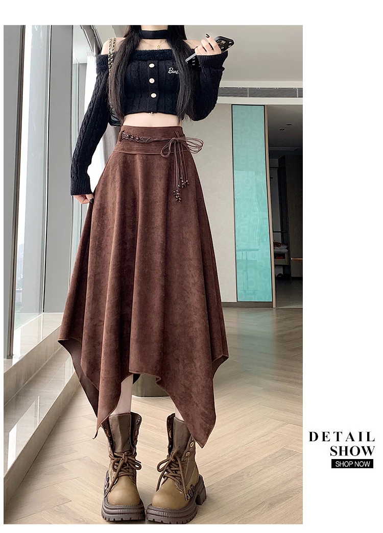 Women’s Desert Vacation Outfit Retro American Black Suede A-line Midi Skirt Belt Asymmetrical Hem Brown Solid Niche Y2K Harajuku