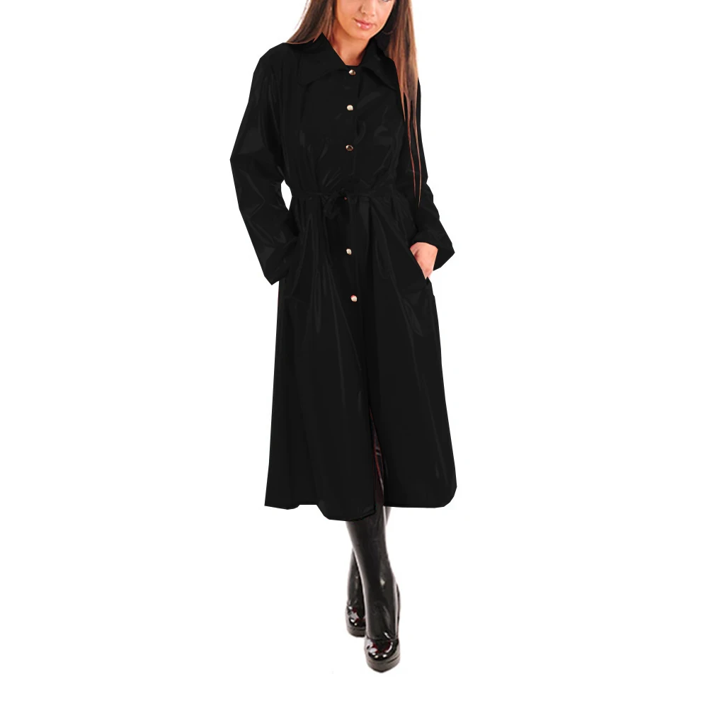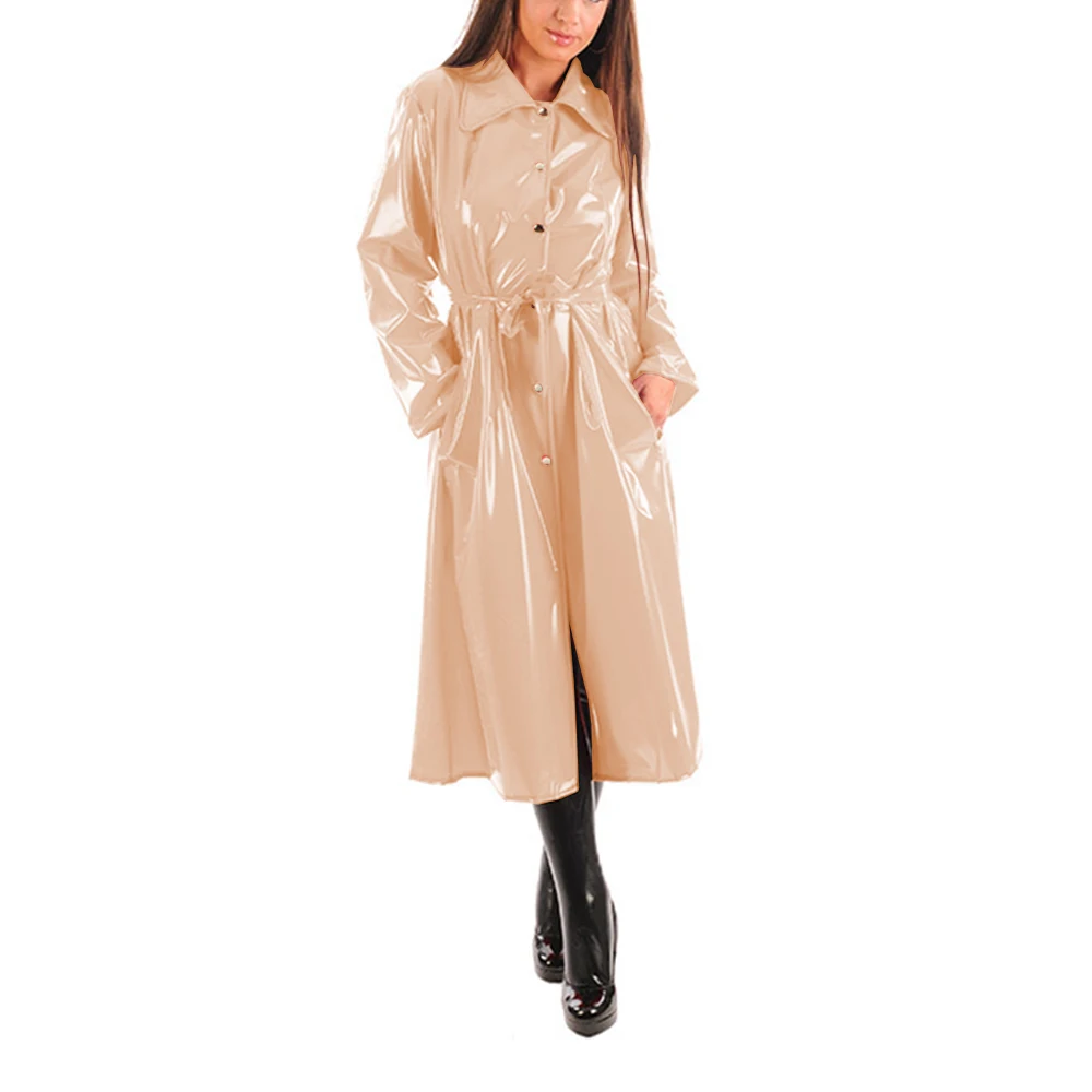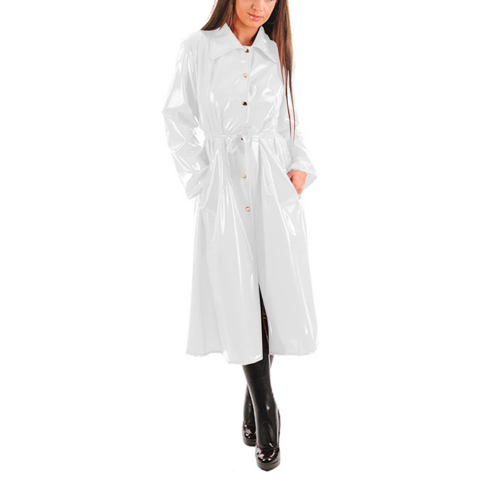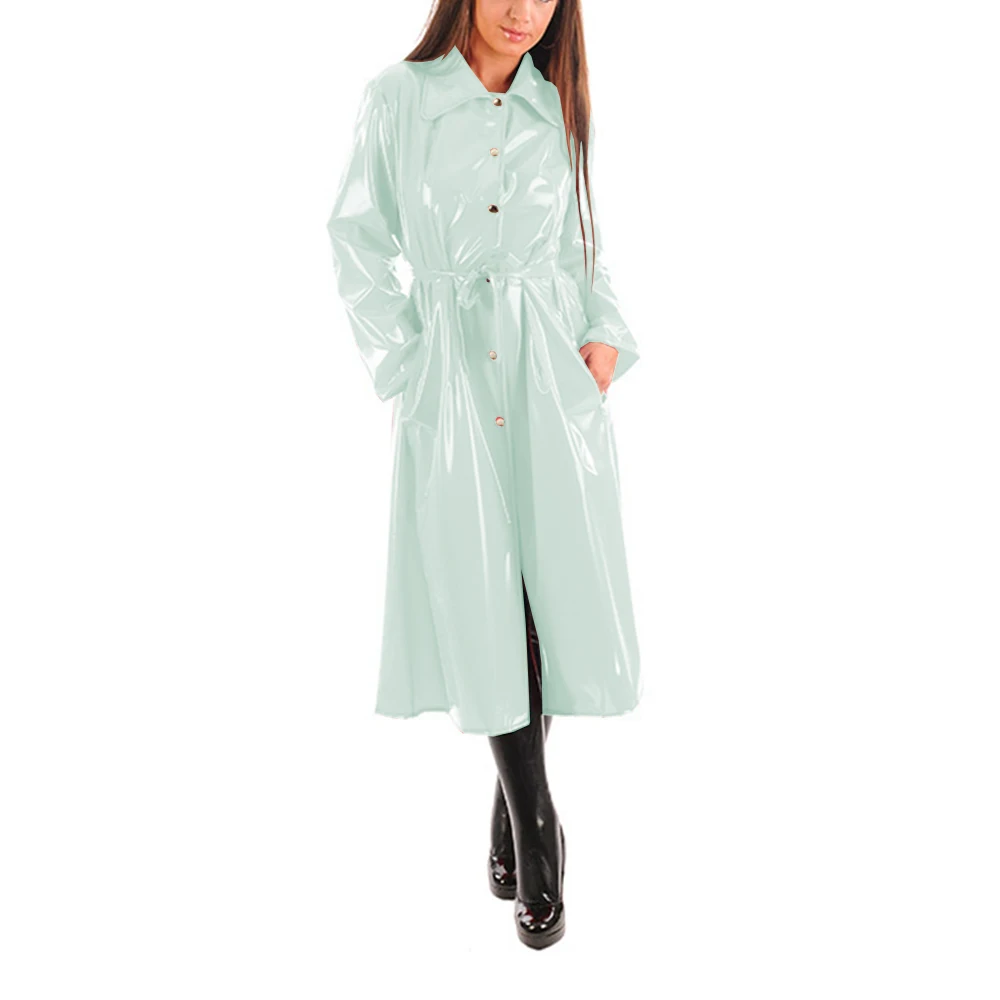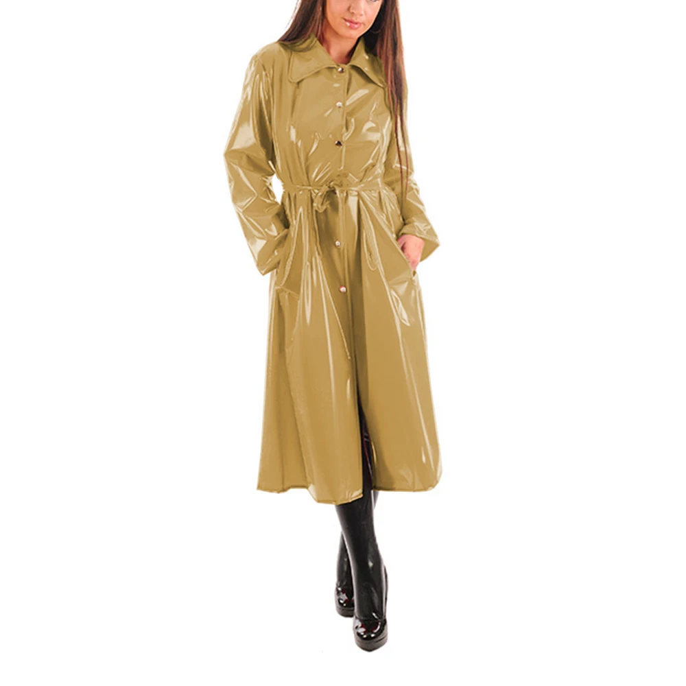 Women’s PU Leather Turn-Down Collar Midi Trench, Shiny Faux Leather, Button-Up, Long Sleeve Dress Coats with Belt, Sexy Wet Look