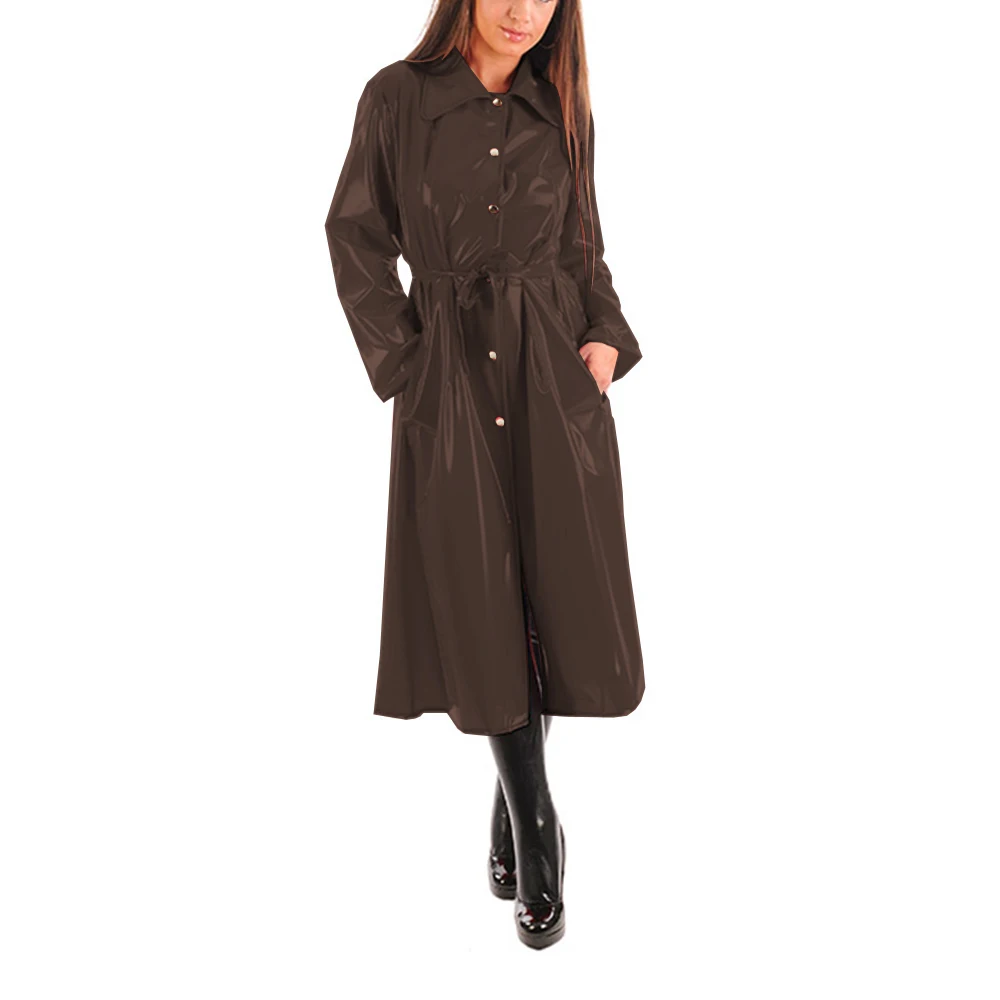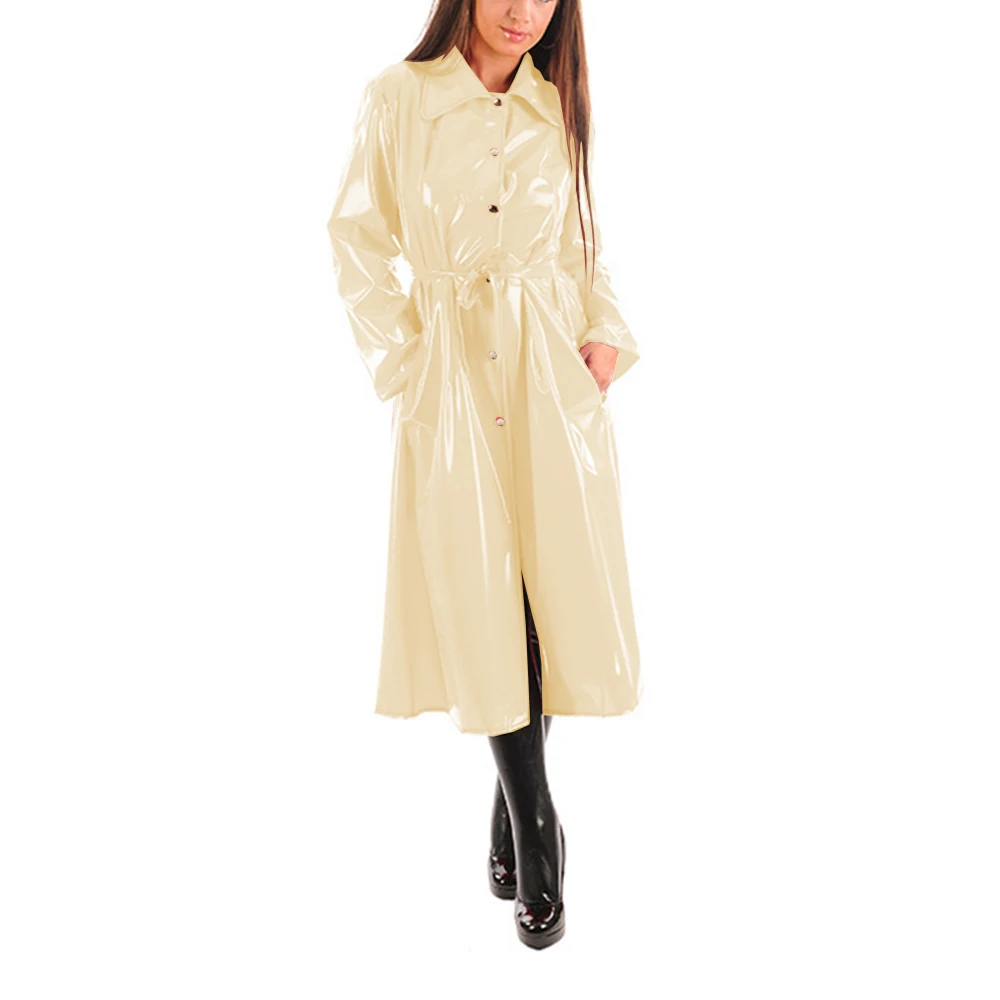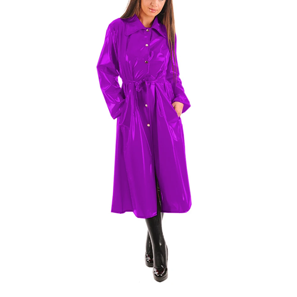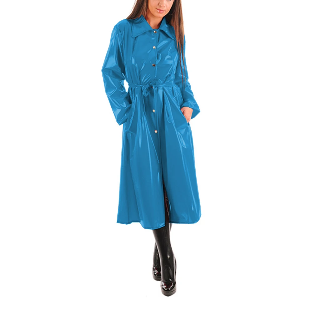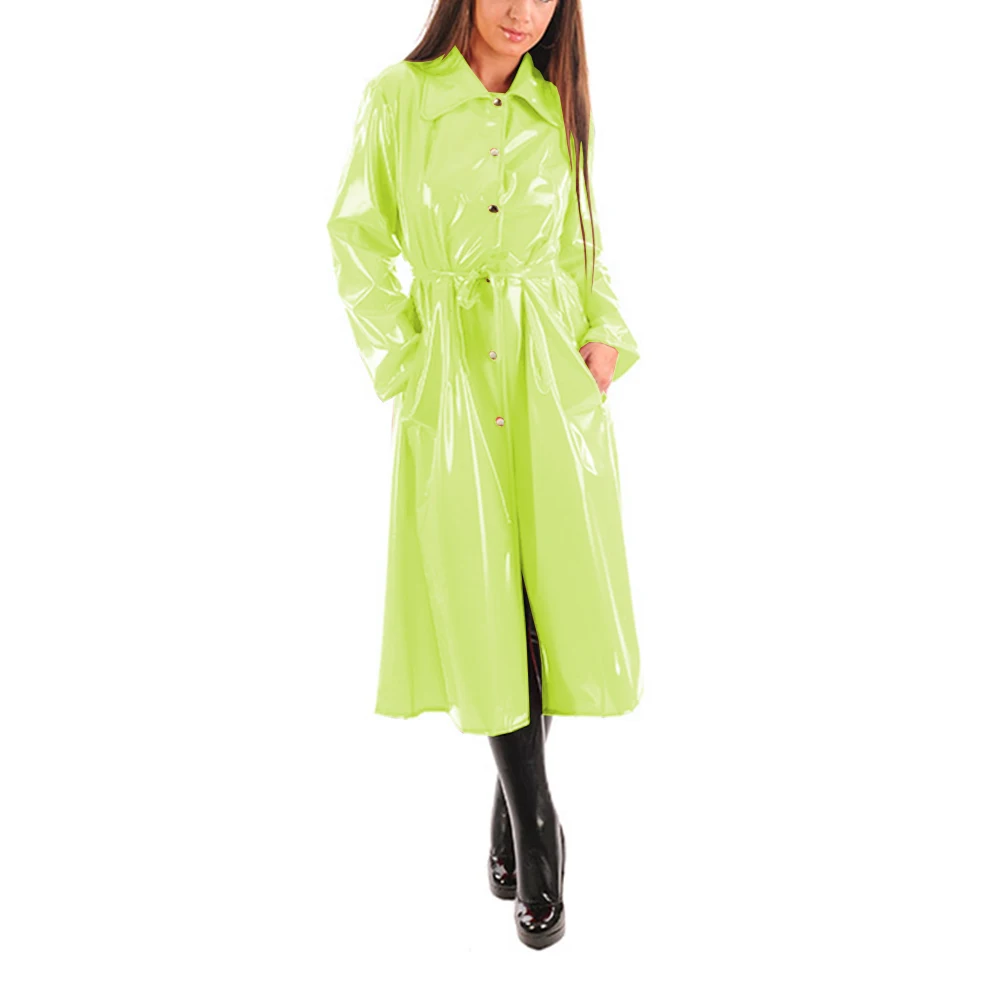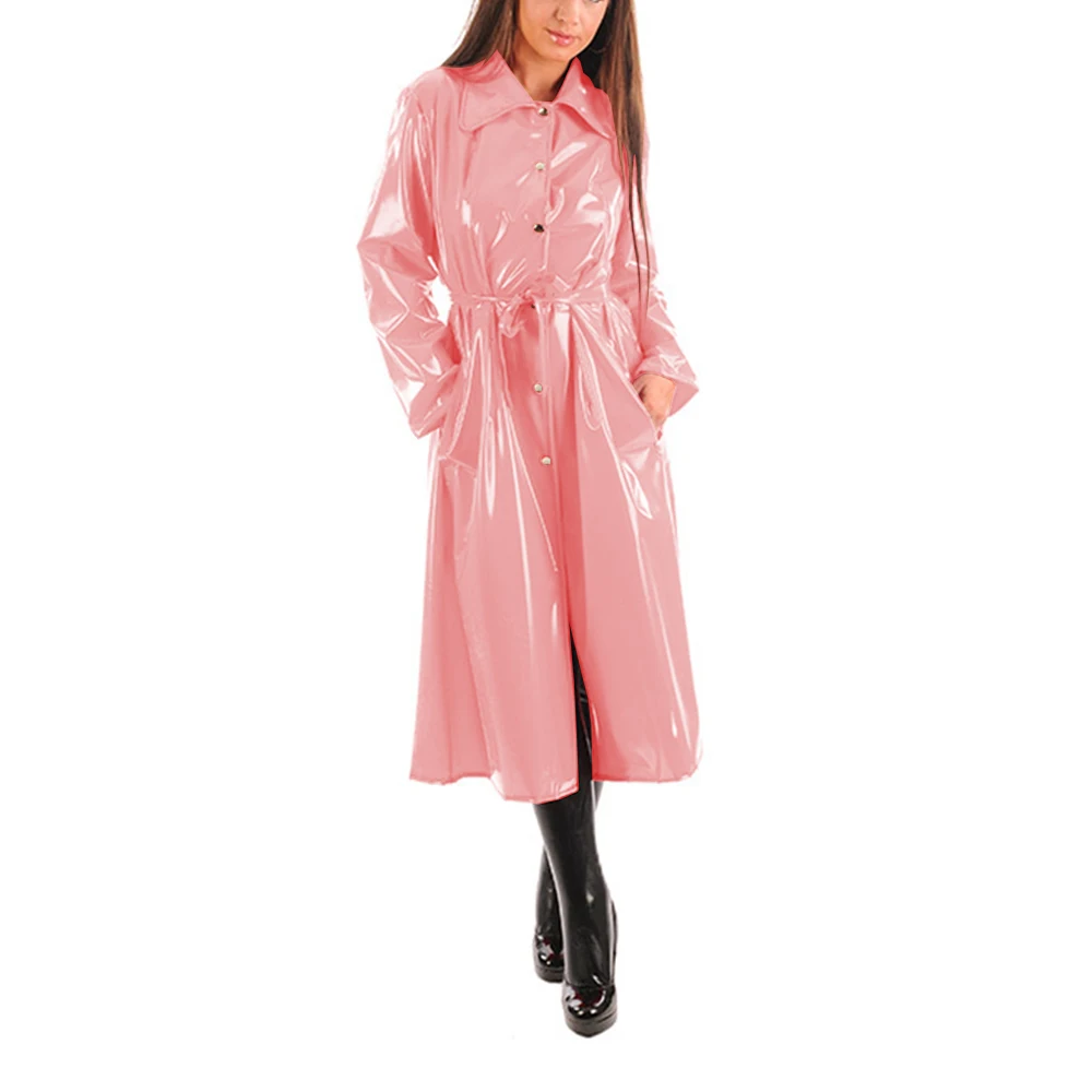 Women’s PU Leather Turn-Down Collar Midi Trench, Shiny Faux Leather, Button-Up, Long Sleeve Dress Coats with Belt, Sexy Wet Look