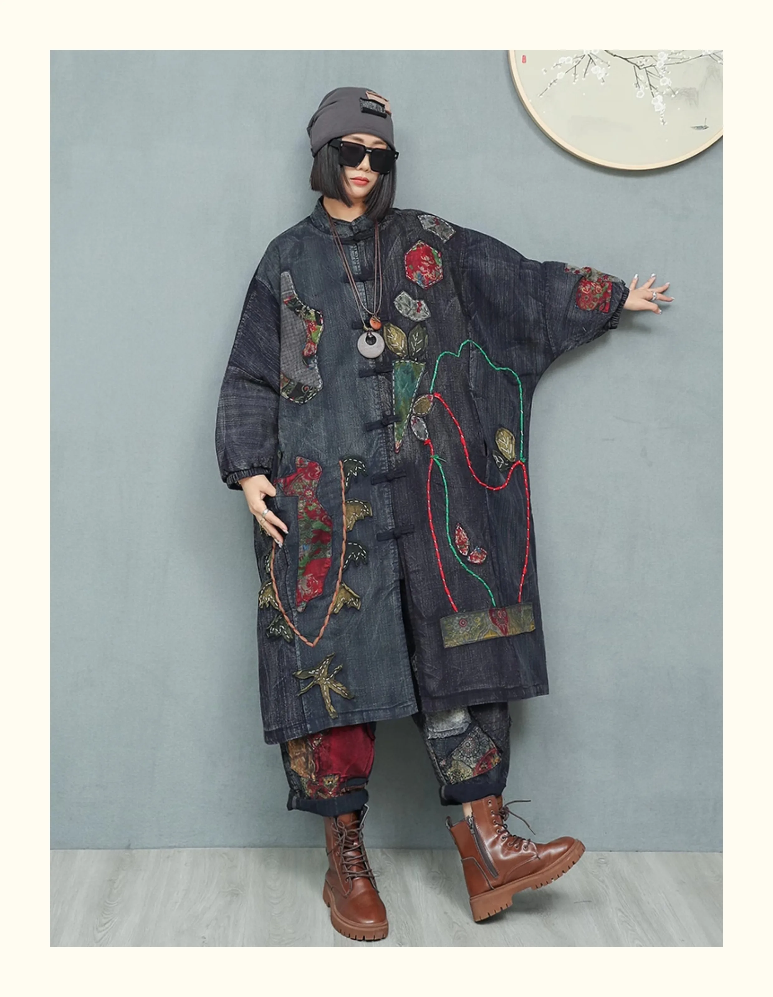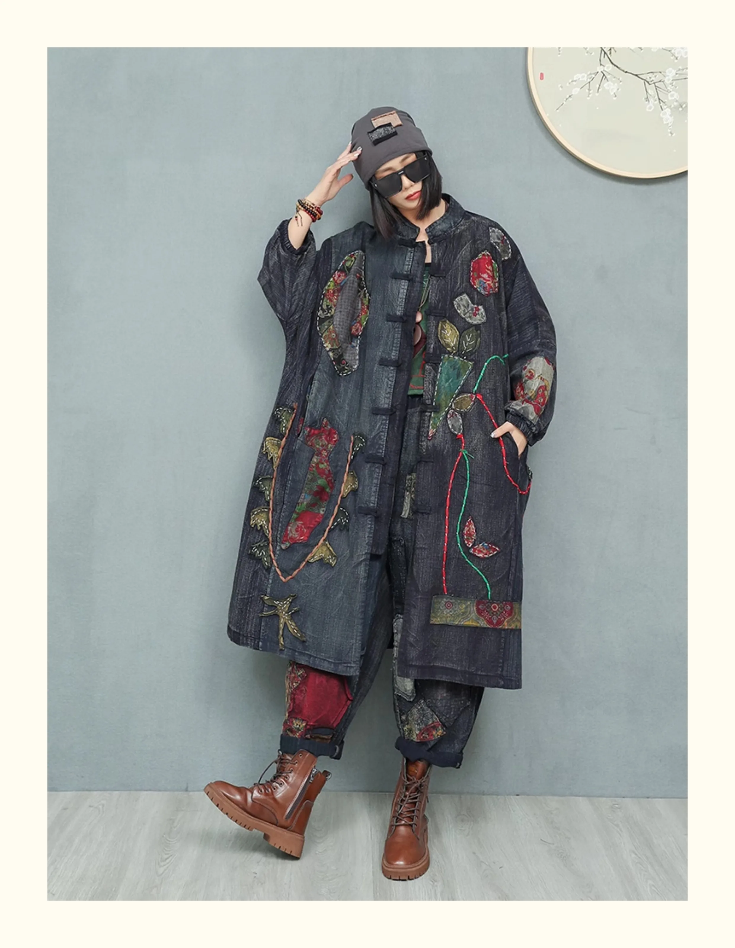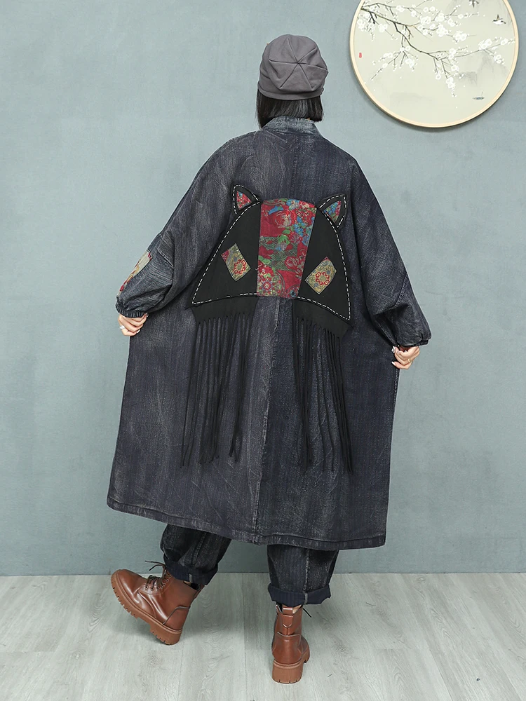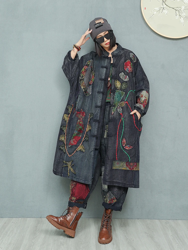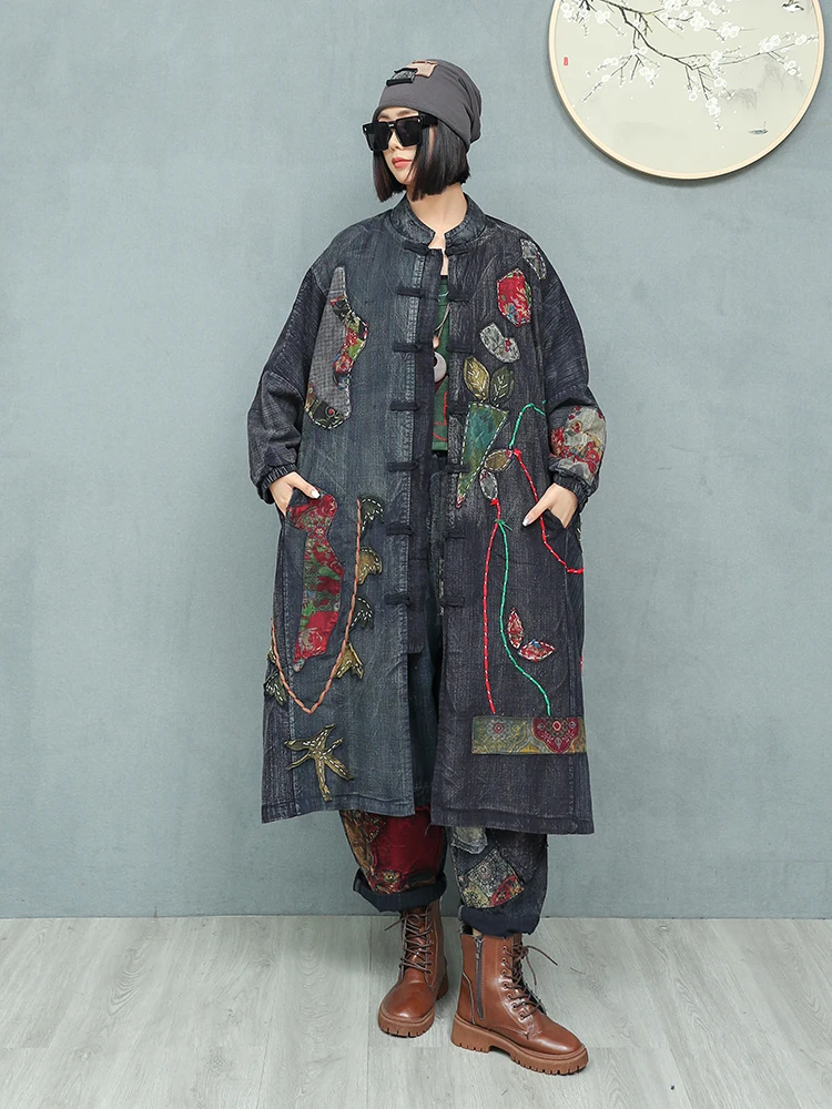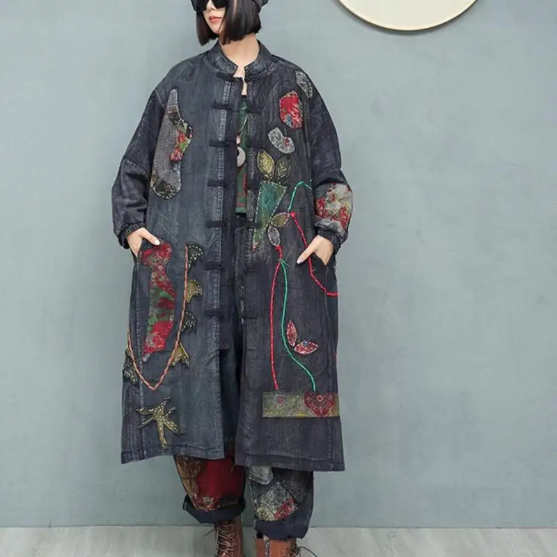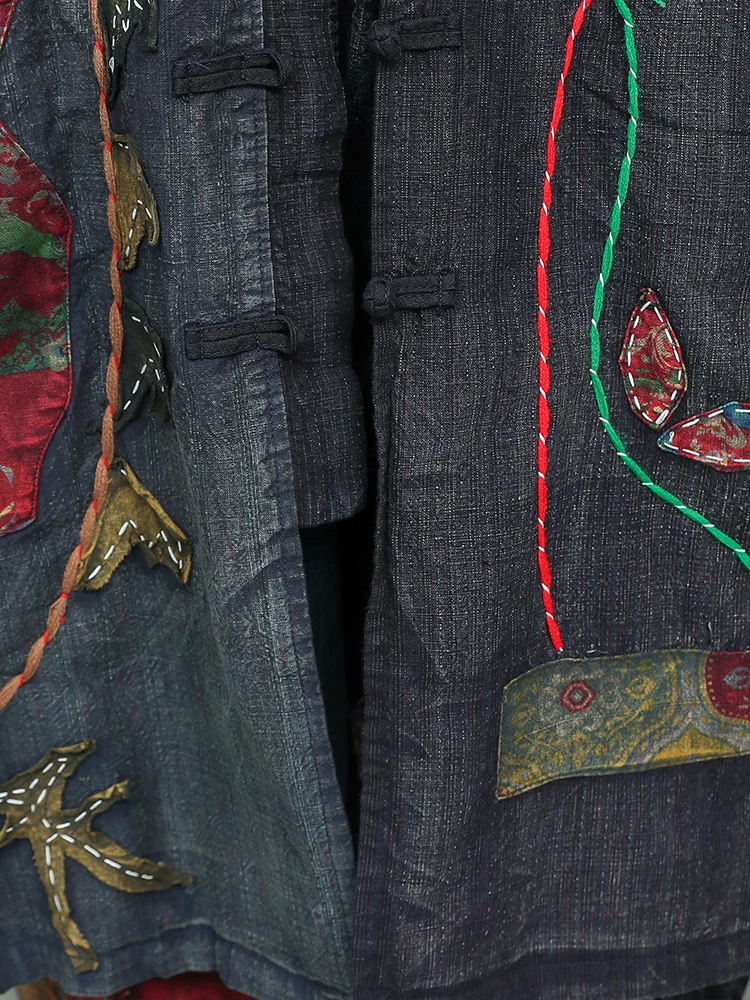 Women’s Spring Embroidered Appliqué Retro Distressed Old Cloth Stitching Disc Button Cardigan Windbreaker Wide-waisted Coat