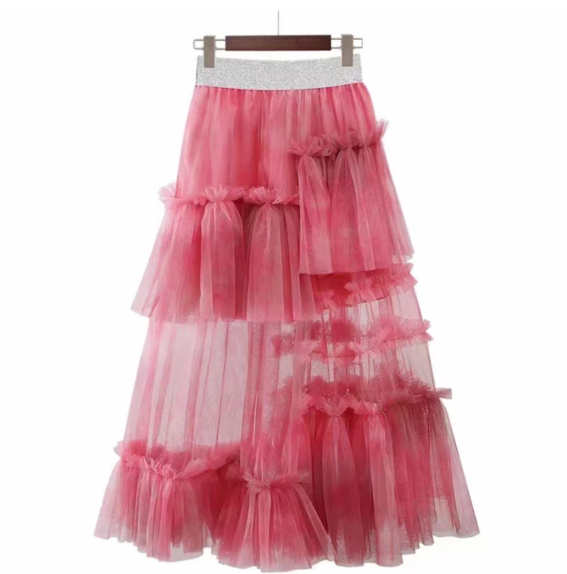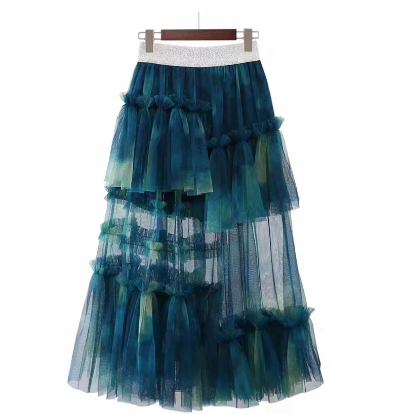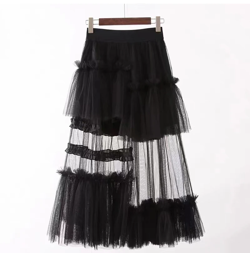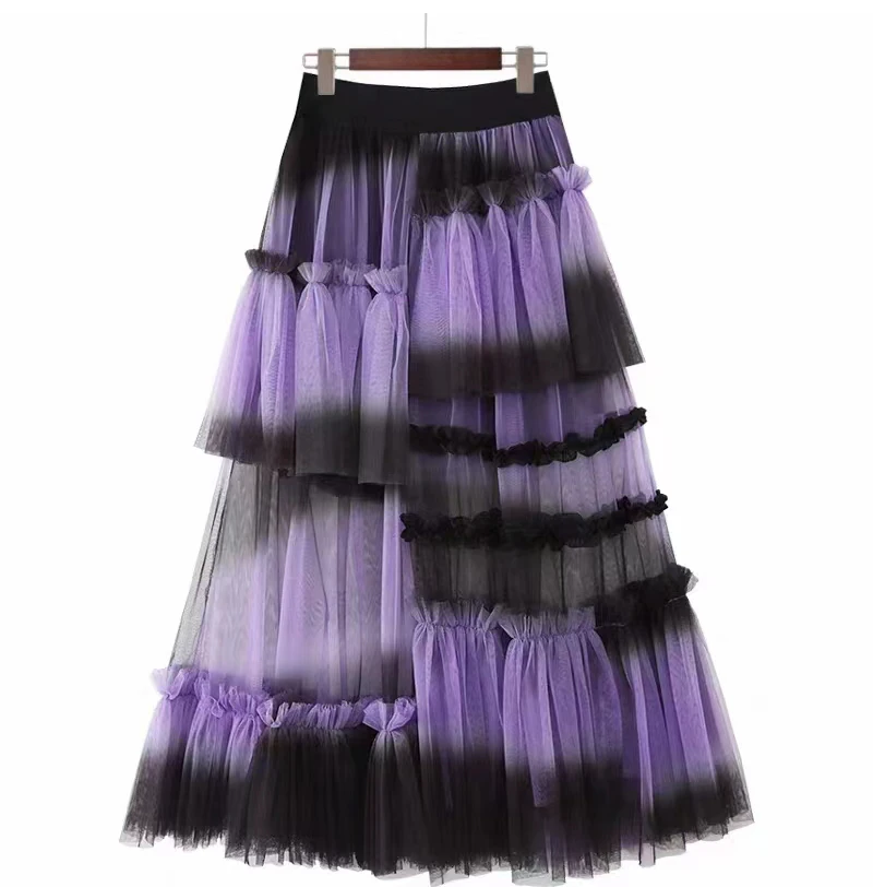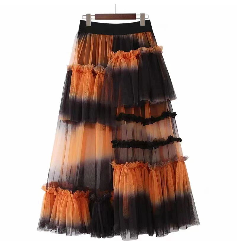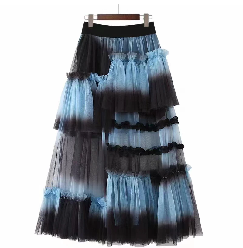 Y2K Goth Irregular Fold Skirt Gauze Skirt Gradient A-Line Casual Mesh Long Skirts Women 2023 Summer New Korean Japenese Style