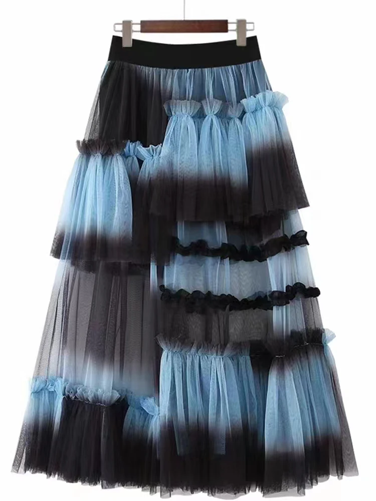 Y2K Goth Irregular Fold Skirt Gauze Skirt Gradient A-Line Casual Mesh Long Skirts Women 2023 Summer New Korean Japenese Style