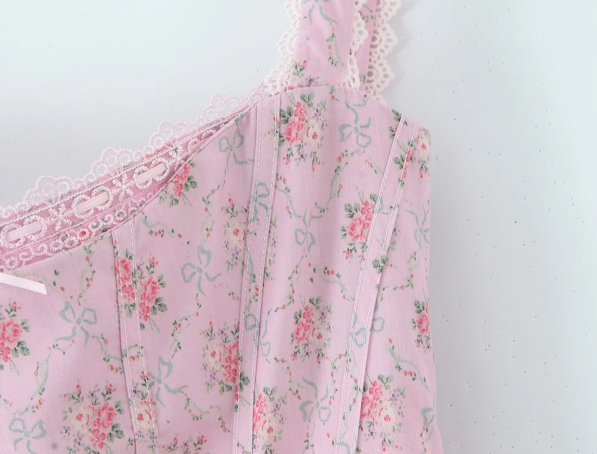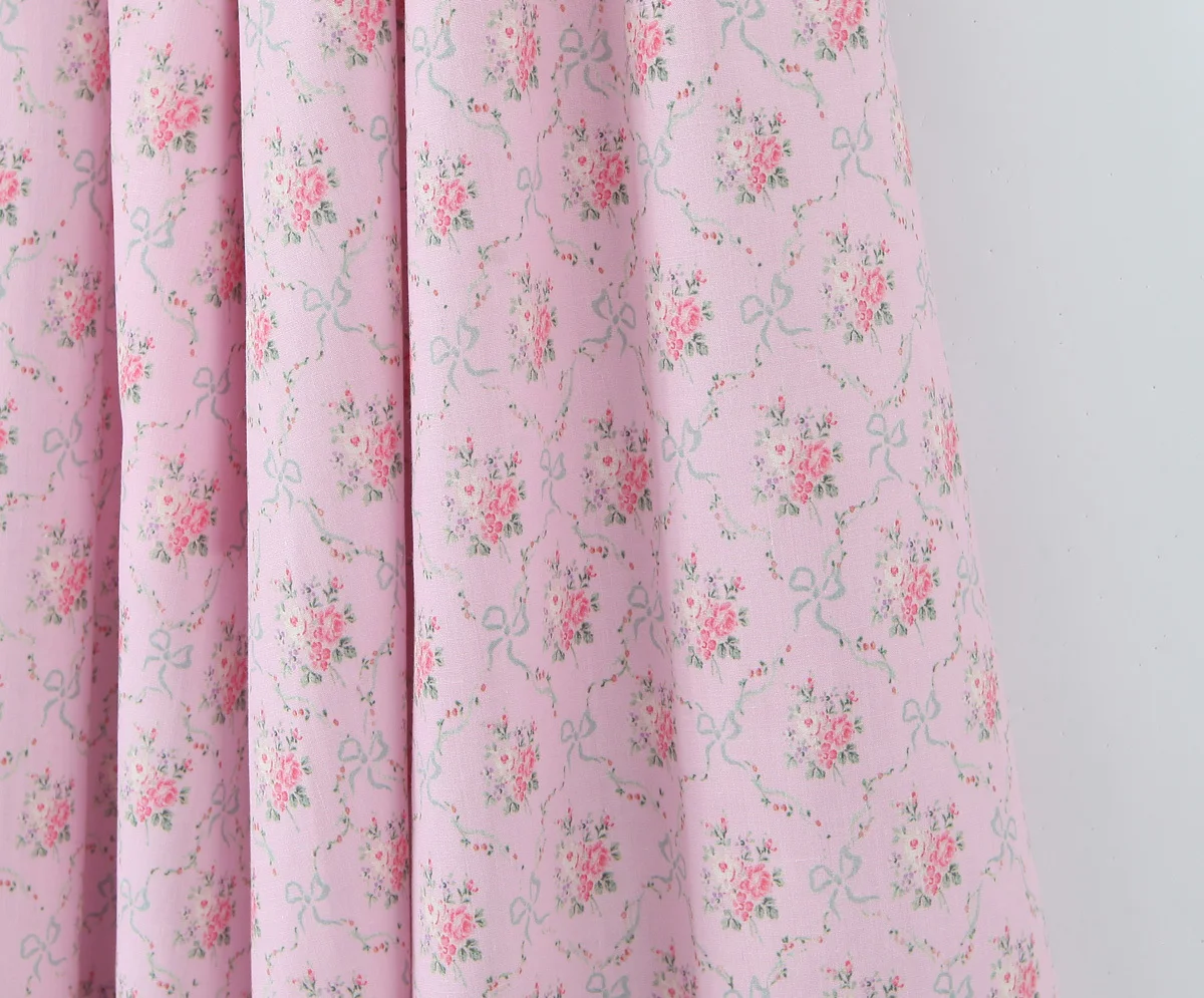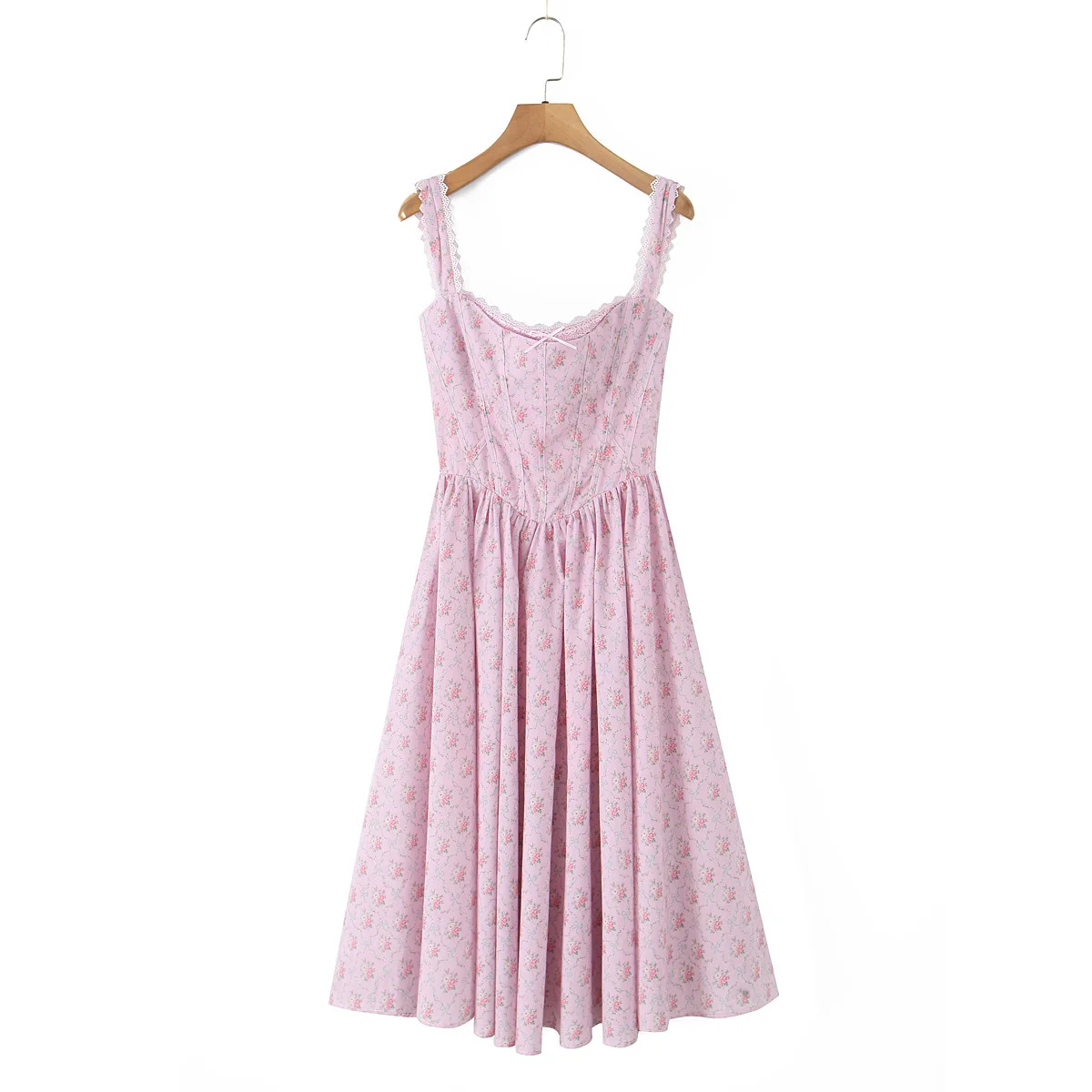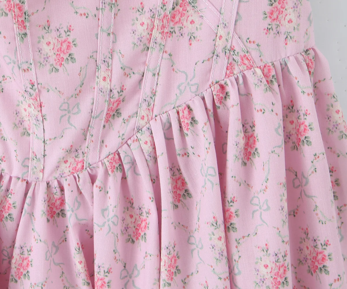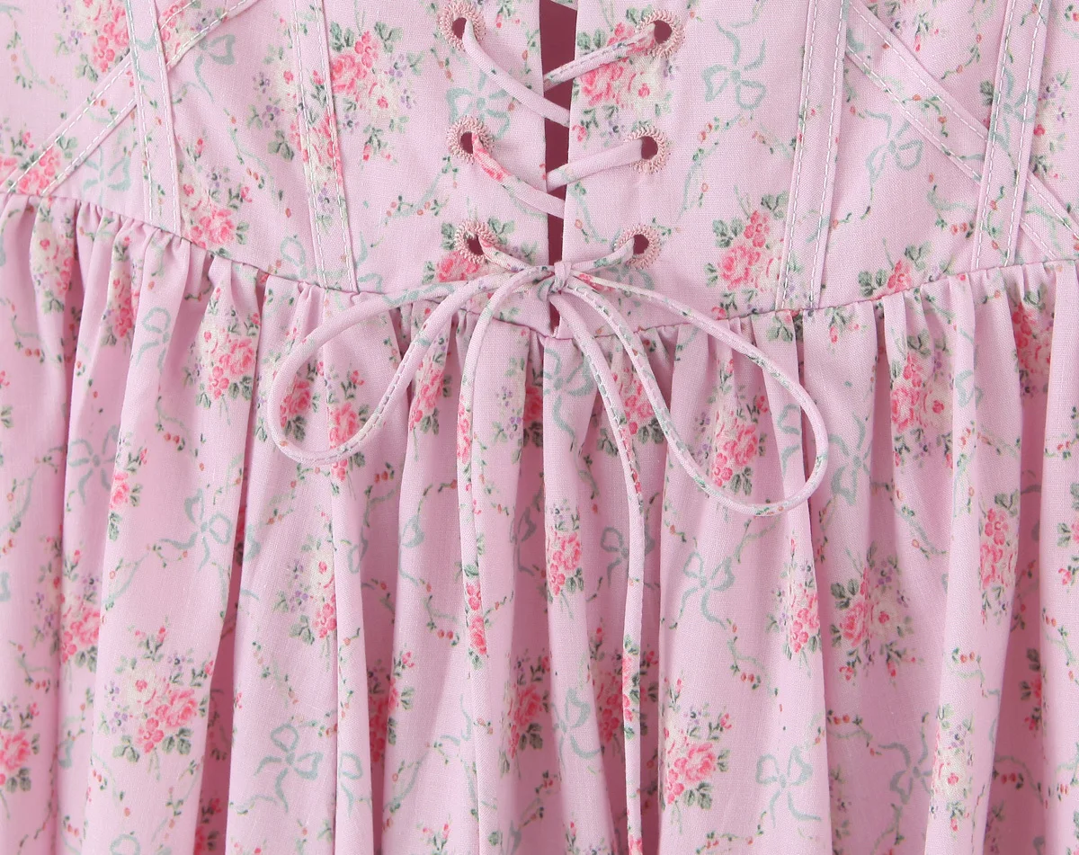 Elegant Pink Floral Print Dress Women Lace Up Bandage Back A-line Midi Summer