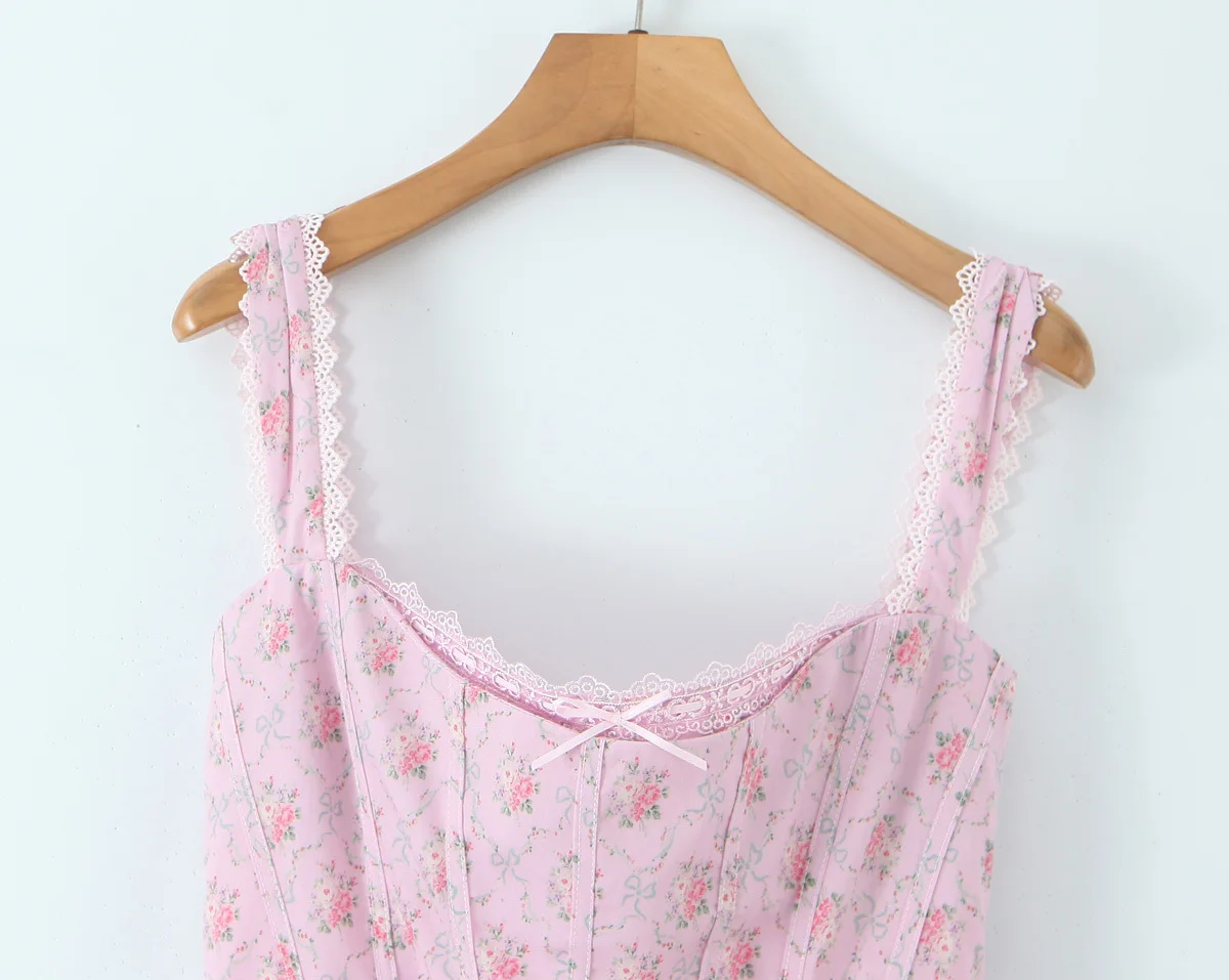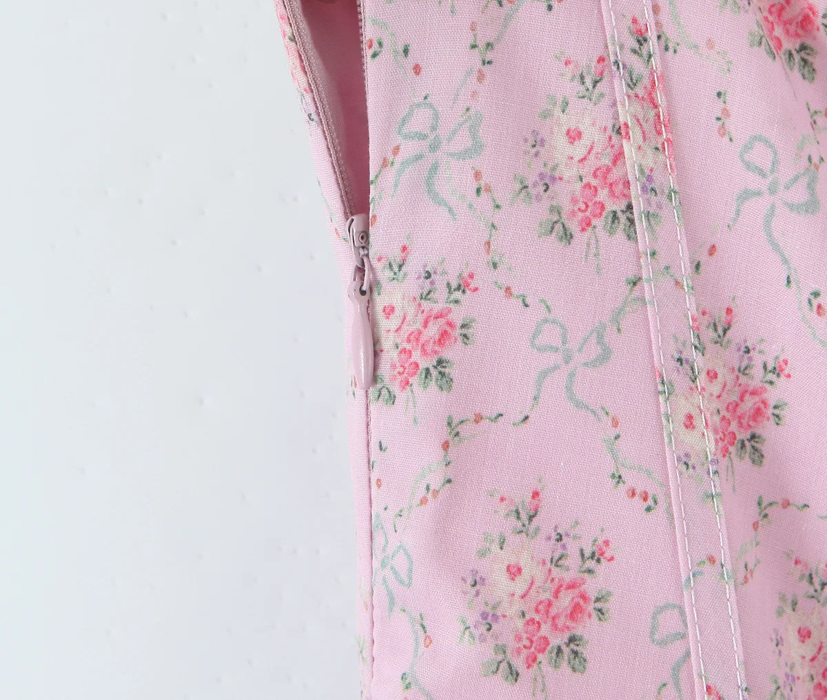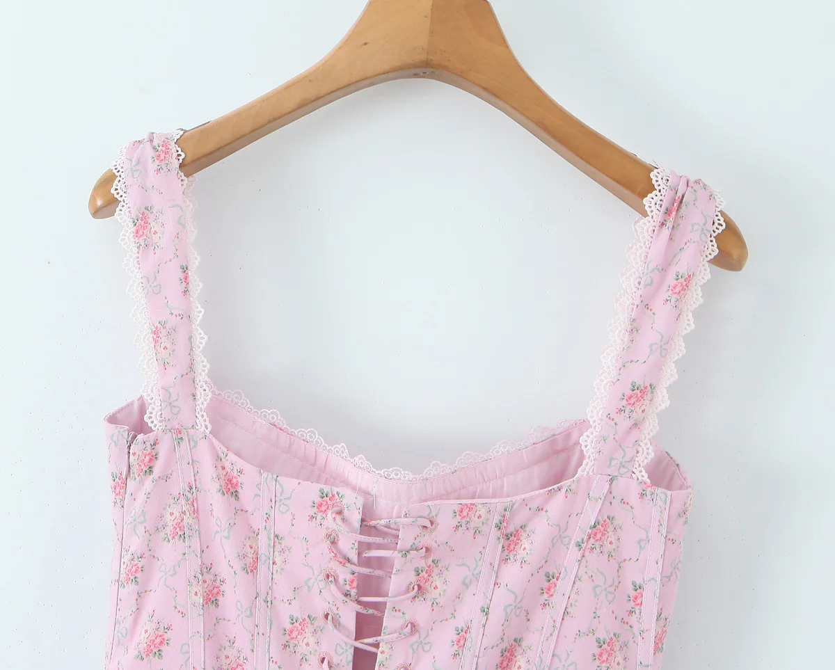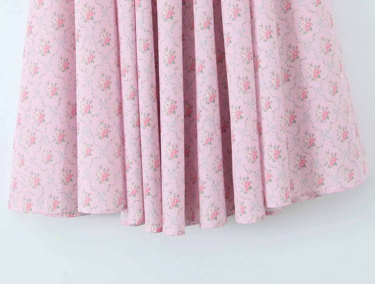 Elegant Pink Floral Print Dress Women Lace Up Bandage Back A-line Midi Summer