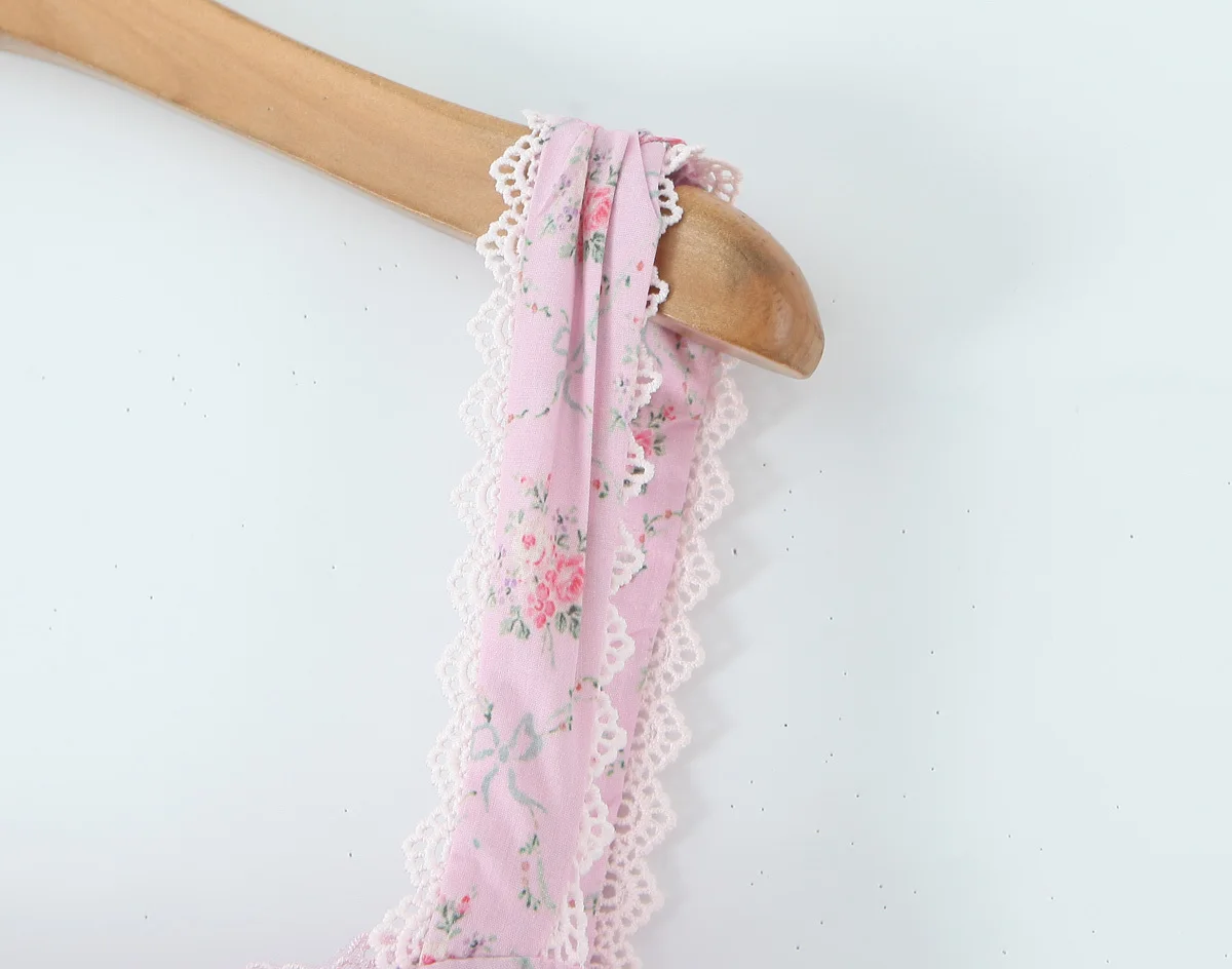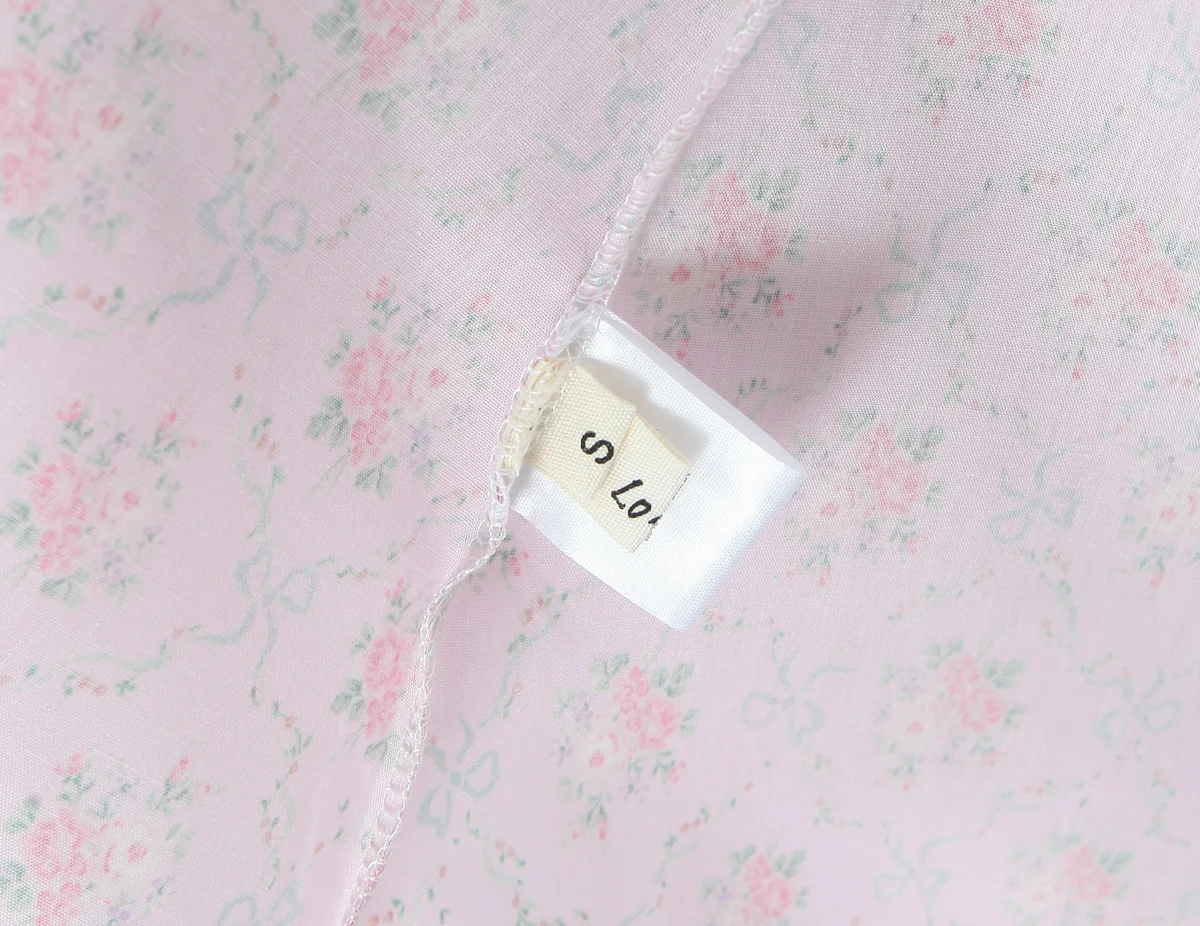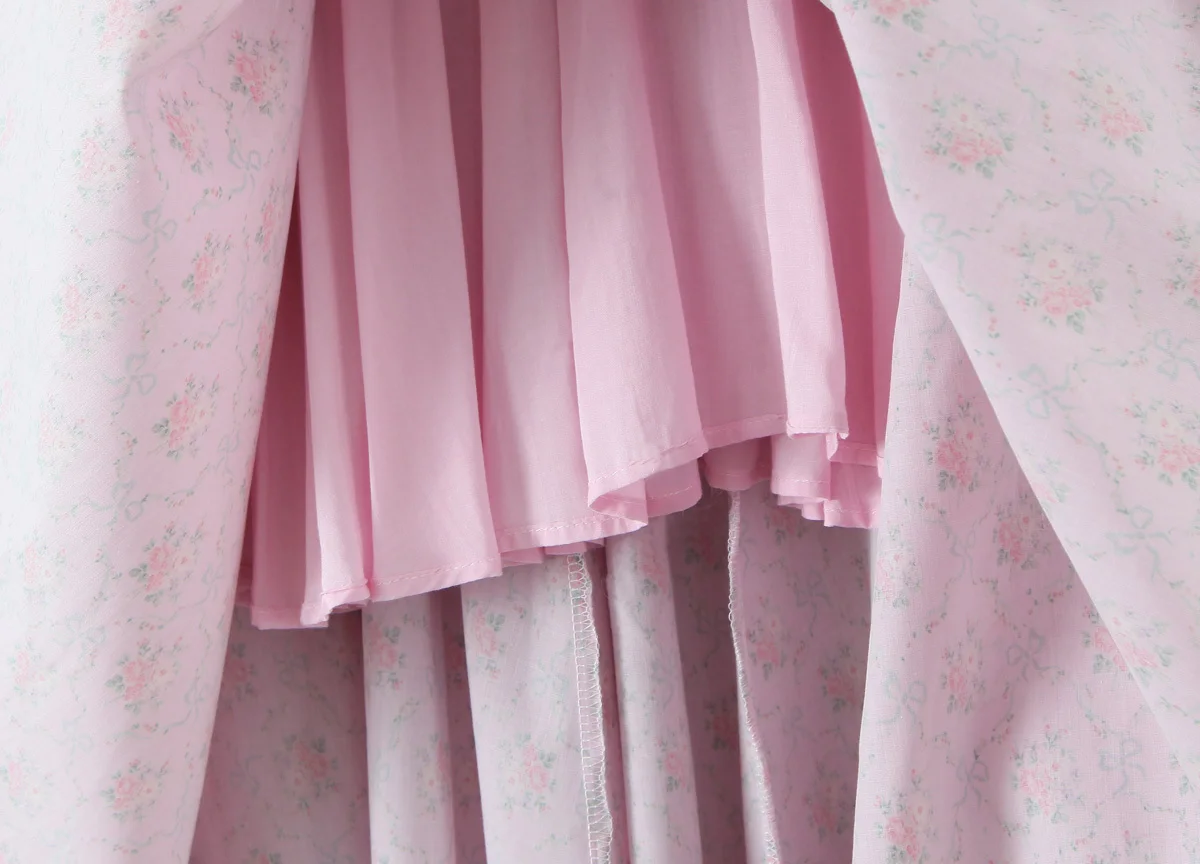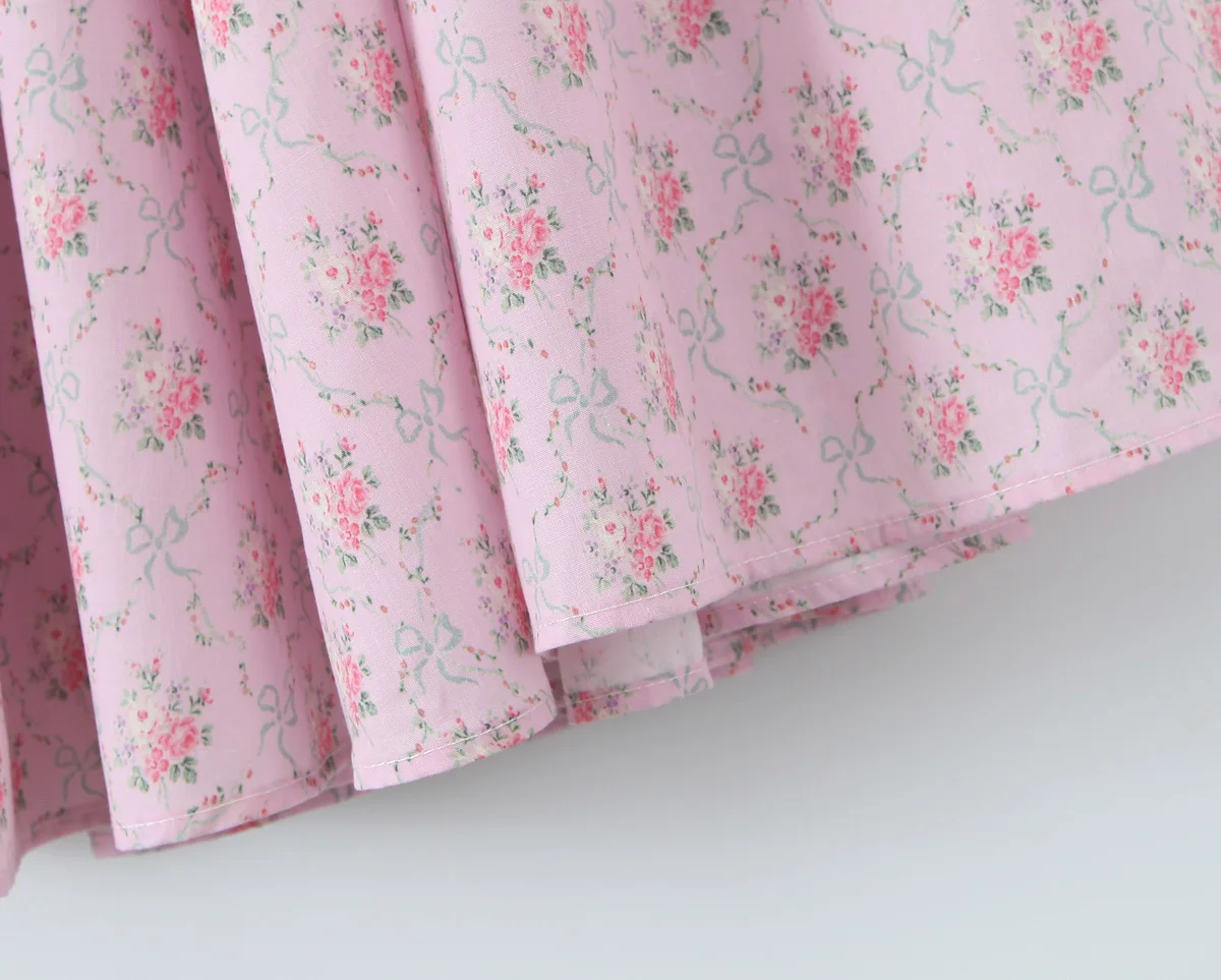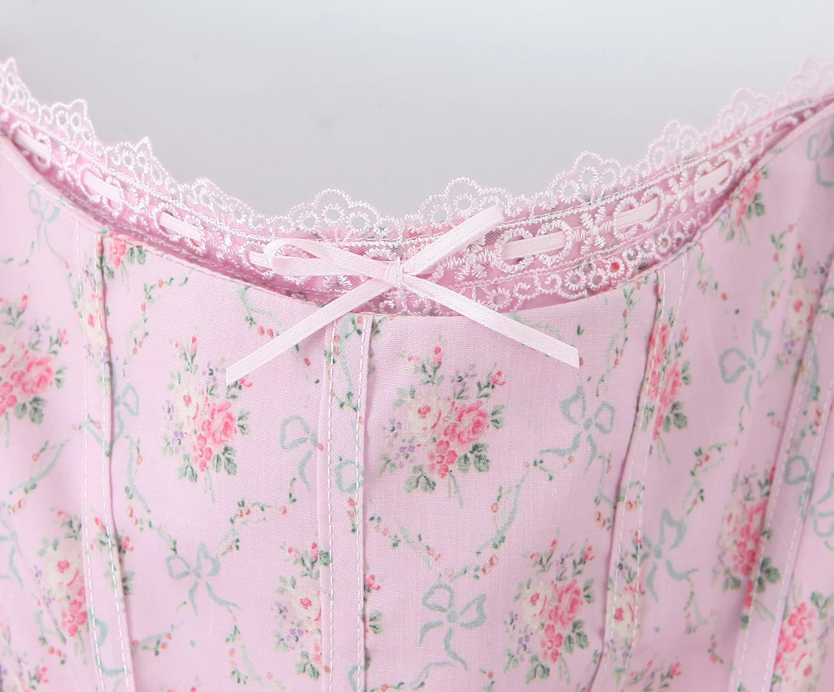 Elegant Pink Floral Print Dress Women Lace Up Bandage Back A-line Midi Summer