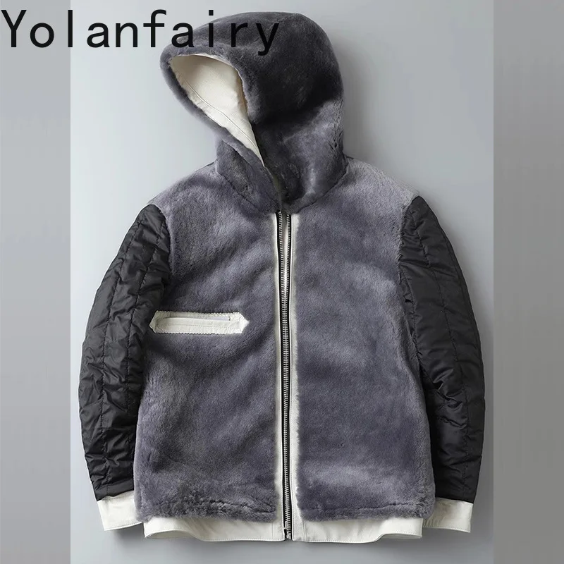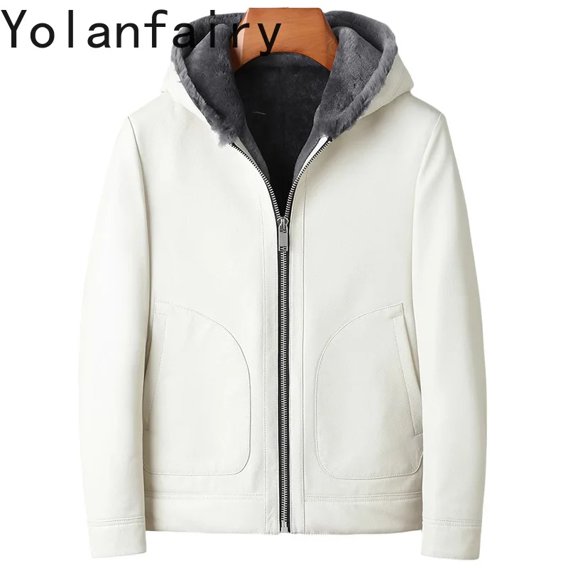 YOLANFAIRY Real Fur Coat Man Winter 2025 Hooded Genuine Goatskin Leather Jacket Short Warm White Fur Coats Wool Lining jaqueta