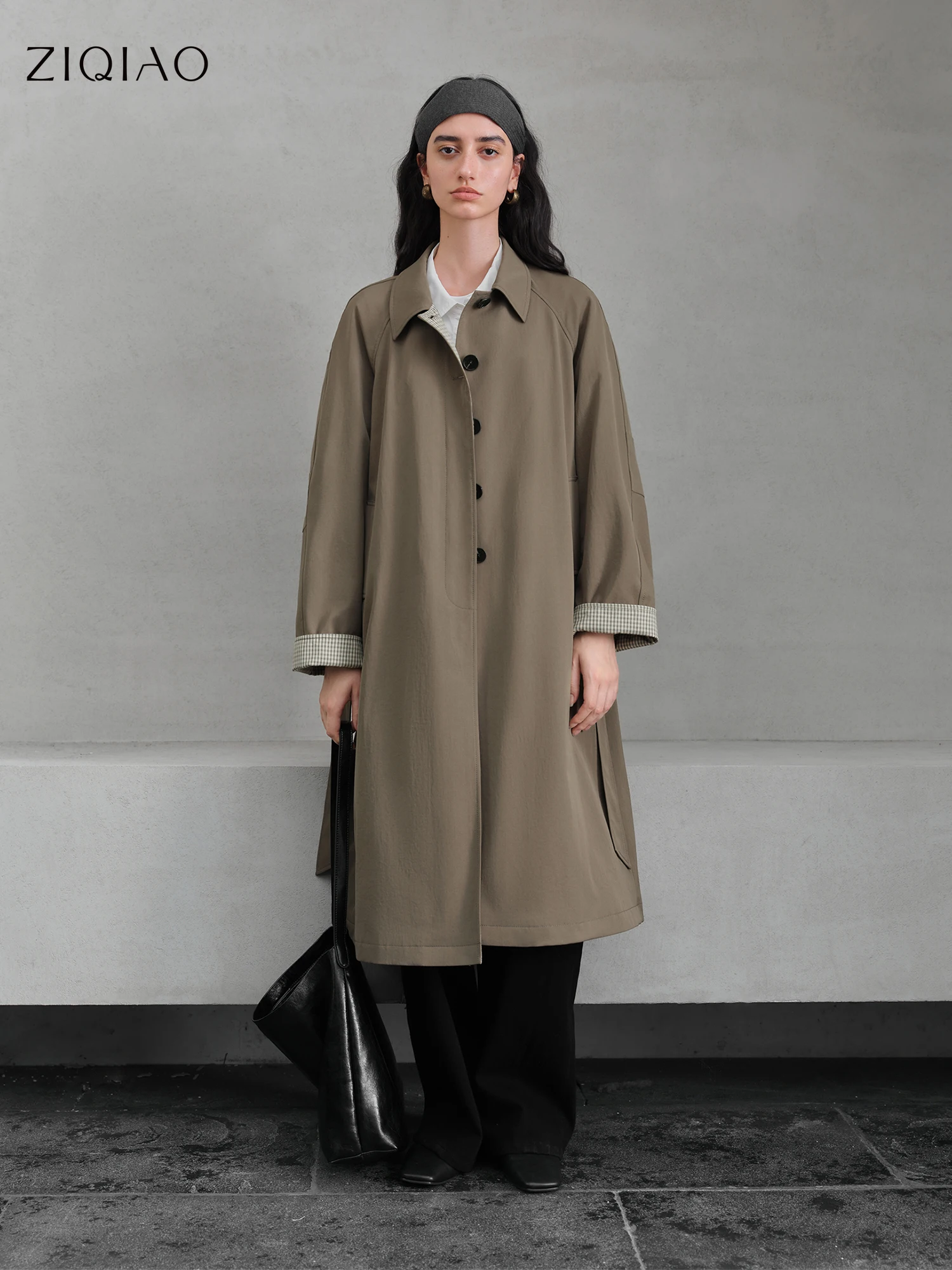 ZIQIAO Plaid British Style Trench Coat Women 2025 Autumn New Retro Mid-length Coat Fashionable All-match Commuting 25ZQ93065