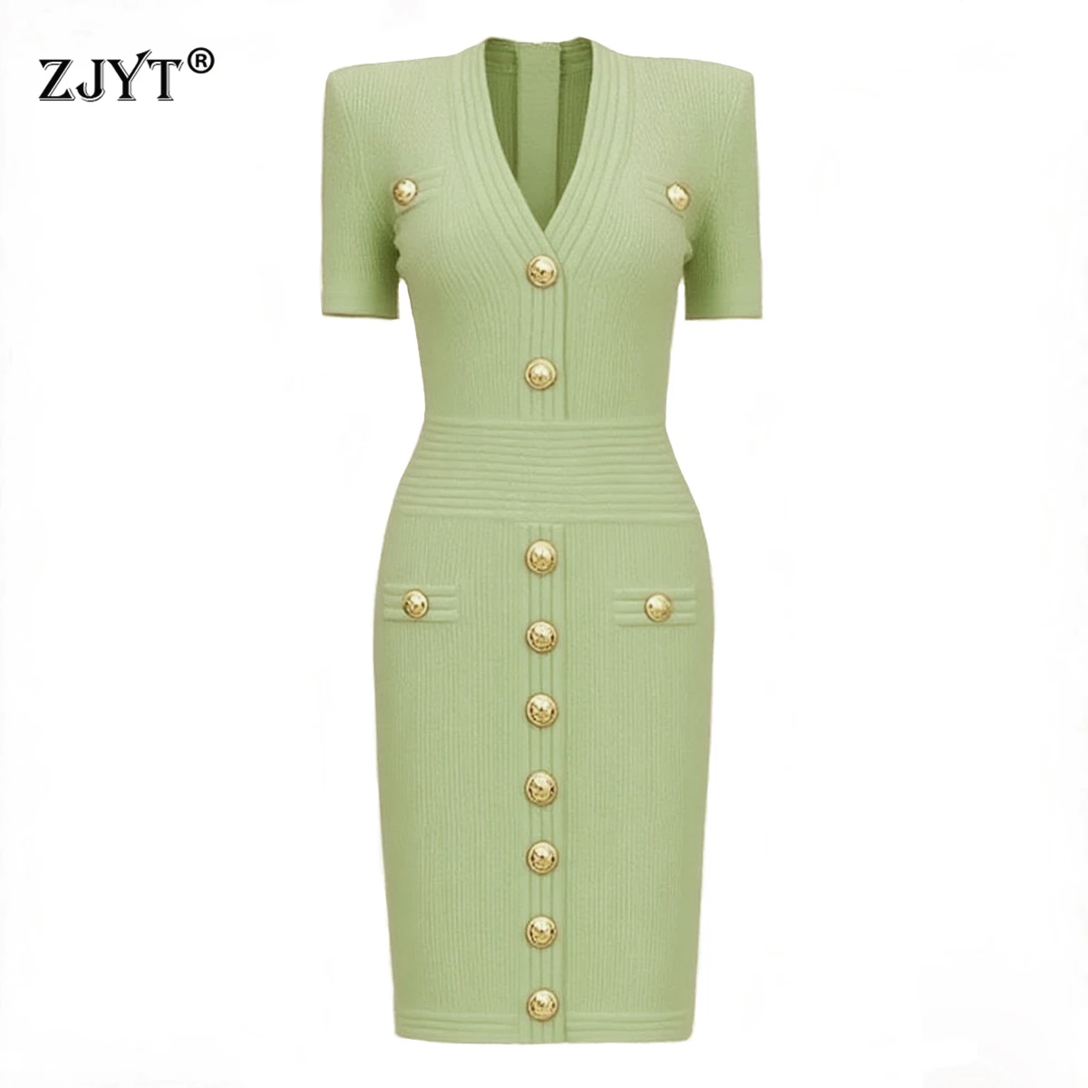 ZJYT Elegant Women’s Midi Knitting Sweater Dresses Green 2025 Fashion Designer V Neck Short Sleeved Buttons Bodycon Party Dress