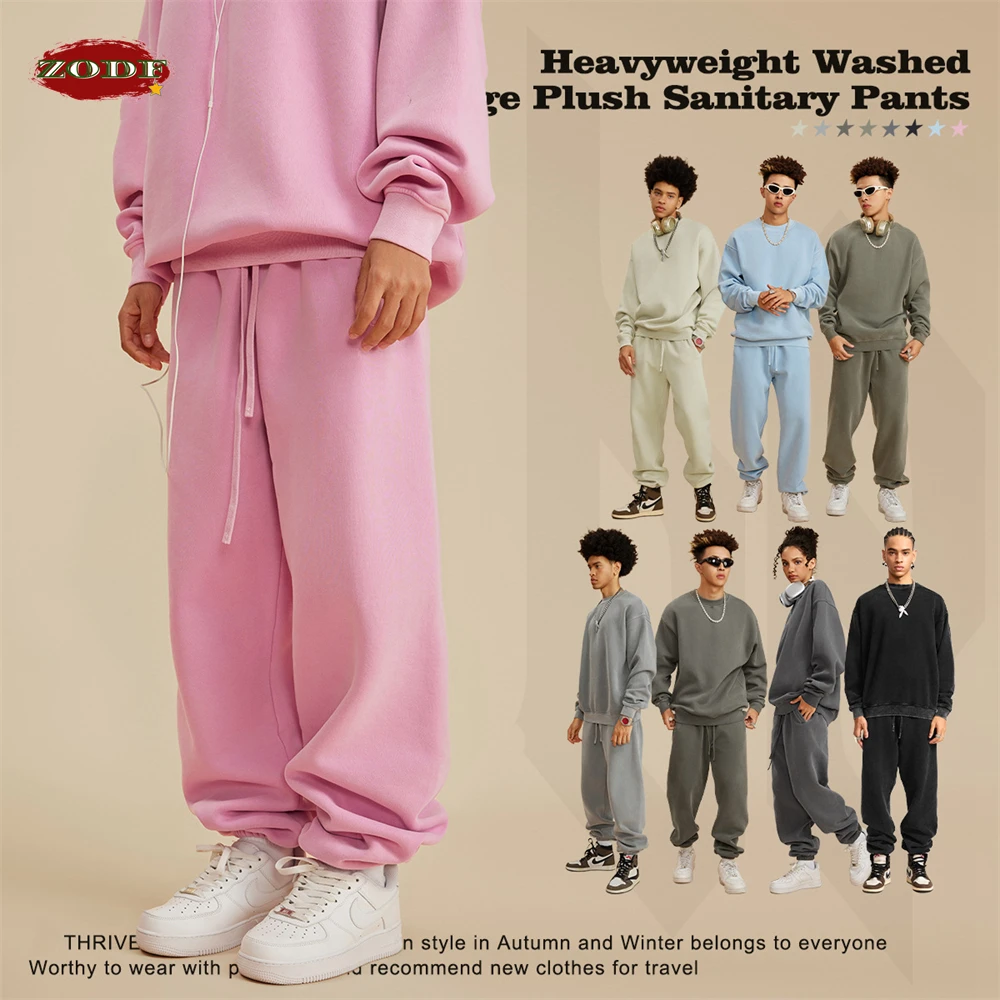 ZODF 2025 Autumn Winter Men’s Washed Sweatpants Retro Unisex Loose 355gsm Warm Fleece Solid Joggers Pants Streetwears HY0653