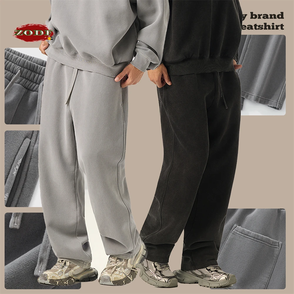 ZODF Winter Warm Man Washed Fleece Straight Pants Unisex 350gsm Ripped Distressed Sport Trousers Brand Bottoms HY0054