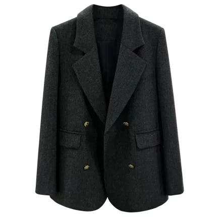 2026 Korean Dark Grey Wool Suit Jacket Women Woolen Blazers Autumn Winter Vintage Double-breasted Casual Tops Lady Office Coats